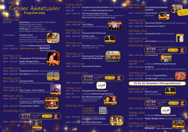 Am 28. November um 18:00 Uhr eröffnet Bürgermeisterin Andrea Lange den Rintelner Adventszauber auf dem Marktplatz. Im Anschluss wird Kinderliedermacher Christian Hüser bei den kleinen und großen Gästen für viel Stimmung sorgen. Um 19:00 Uhr folgt die erste Ziehung des beliebten Weihnachtsgewinnspiels. Danach können Sie mit der Band „Brisant“, die Eröffnung des Adventszaubers feiern.