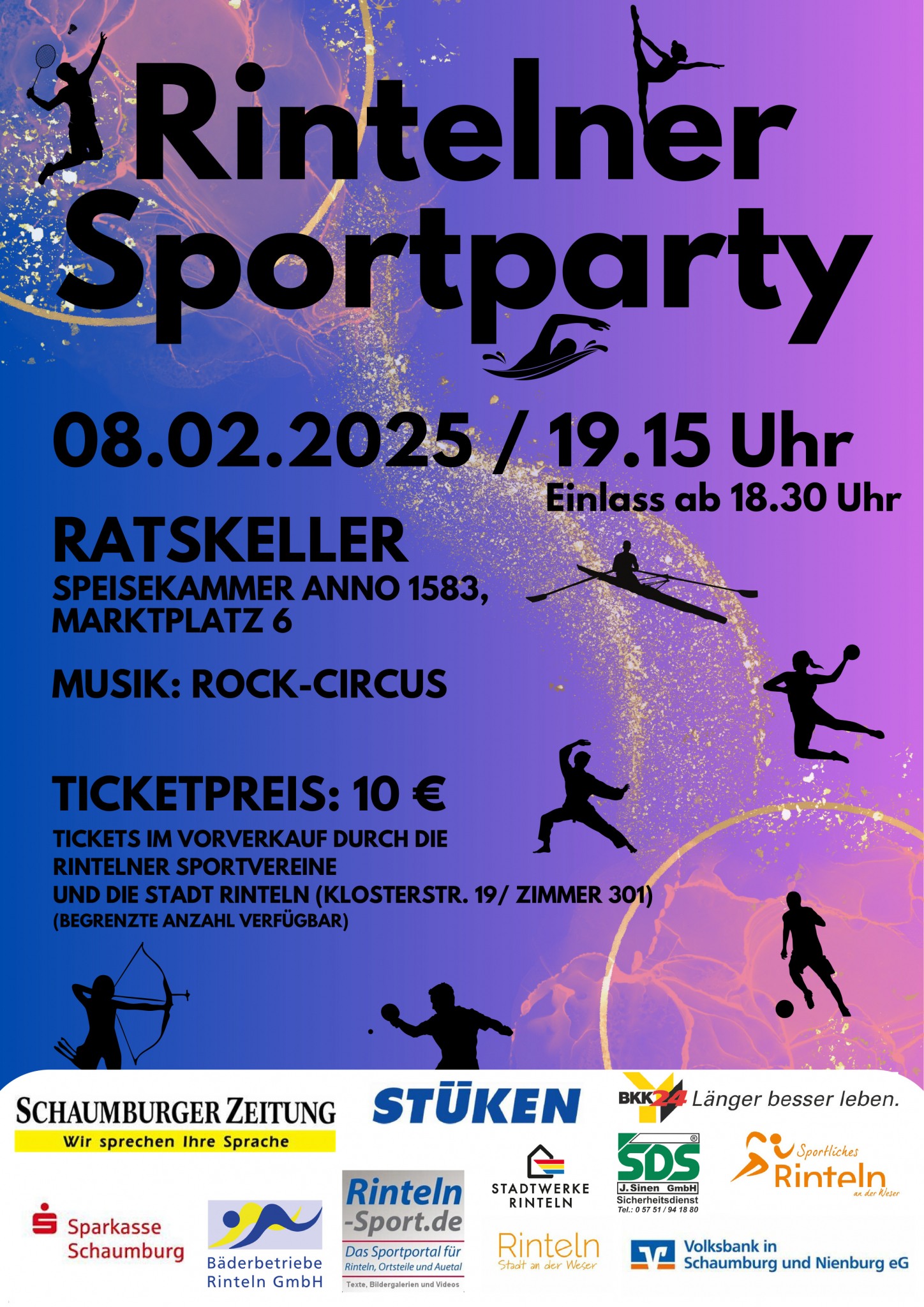 Die Zahl der Eintrittskarten für die Sportparty ist begrenzt. Die Karten sind zum Preis von 10 Euro bei vielen Rintelner Sportvereinen und bei der Stadt Rinteln, Klosterstr. 19, Zimmer 301, Tel.: 403-405 erhältlich.
