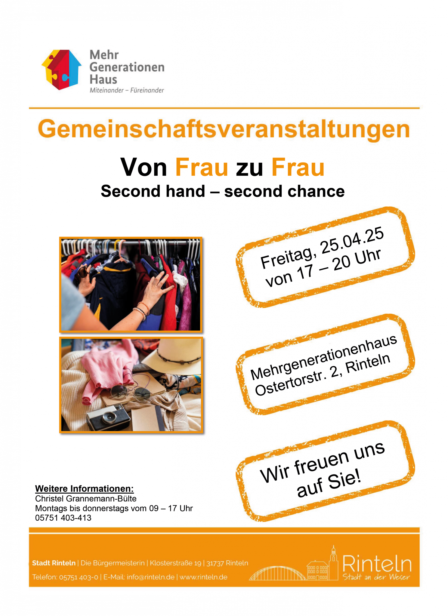 Für alle Klamottensüchtigen und Schnäppchenjägerinnen findet am Freitag, den 25. April 2025, von 17:00 bis 20:00 Uhr wieder der Flohmarkt „Von Frau zu Frau" im Rintelner Mehrgenerationenhaus statt. An vielen Ständen findet „Frau" garantiert, was ihr Herz begehrt. Also die Freundinnen schnappen und auf ins Abenteuer - zu dem natürlich auch Männer herzlich eingeladen sind.