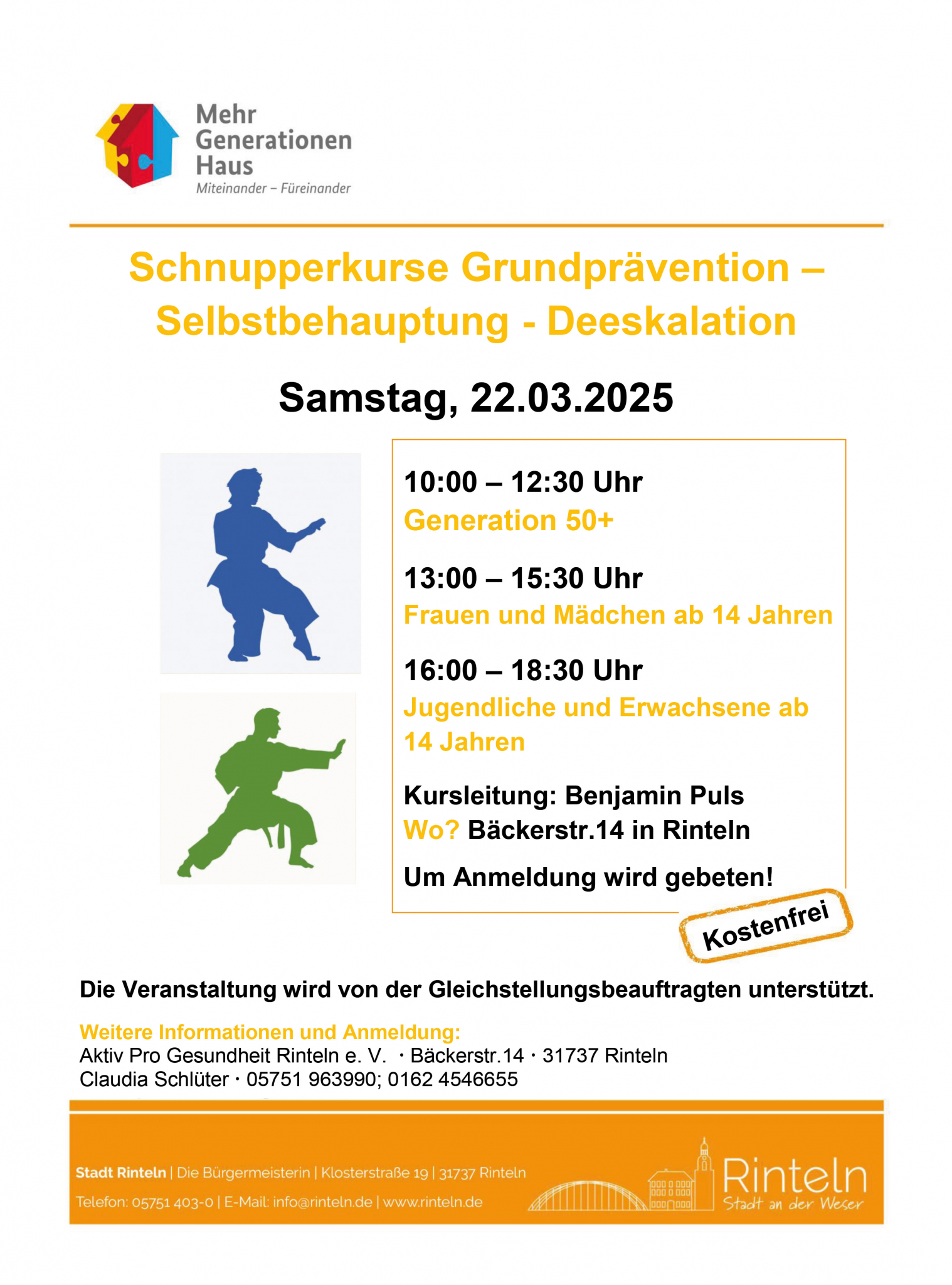 Um möglichst vielen Interessierten die Möglichkeit zu geben, ein solches Körperbewusstsein zu entwickeln, bietet das Mehrgenerationenhaus gemeinsam mit der Gleichstellungsbeauftragten und dem Budo SV Rinteln e.V. Workshops für unterschiedliche Alters- und Zielgruppen an. Ziel des Angebotes ist es, das Selbstbewusstsein der Teilnehmenden zu stärken sowie Deeskalationsstrategien und einfache Selbstverteidigungstechniken kennenzulernen. Mit dem Gefühl der Sicherheit wächst die mentale Stärke - das strahlt aus und beugt potenziellen Gefahren vor.
