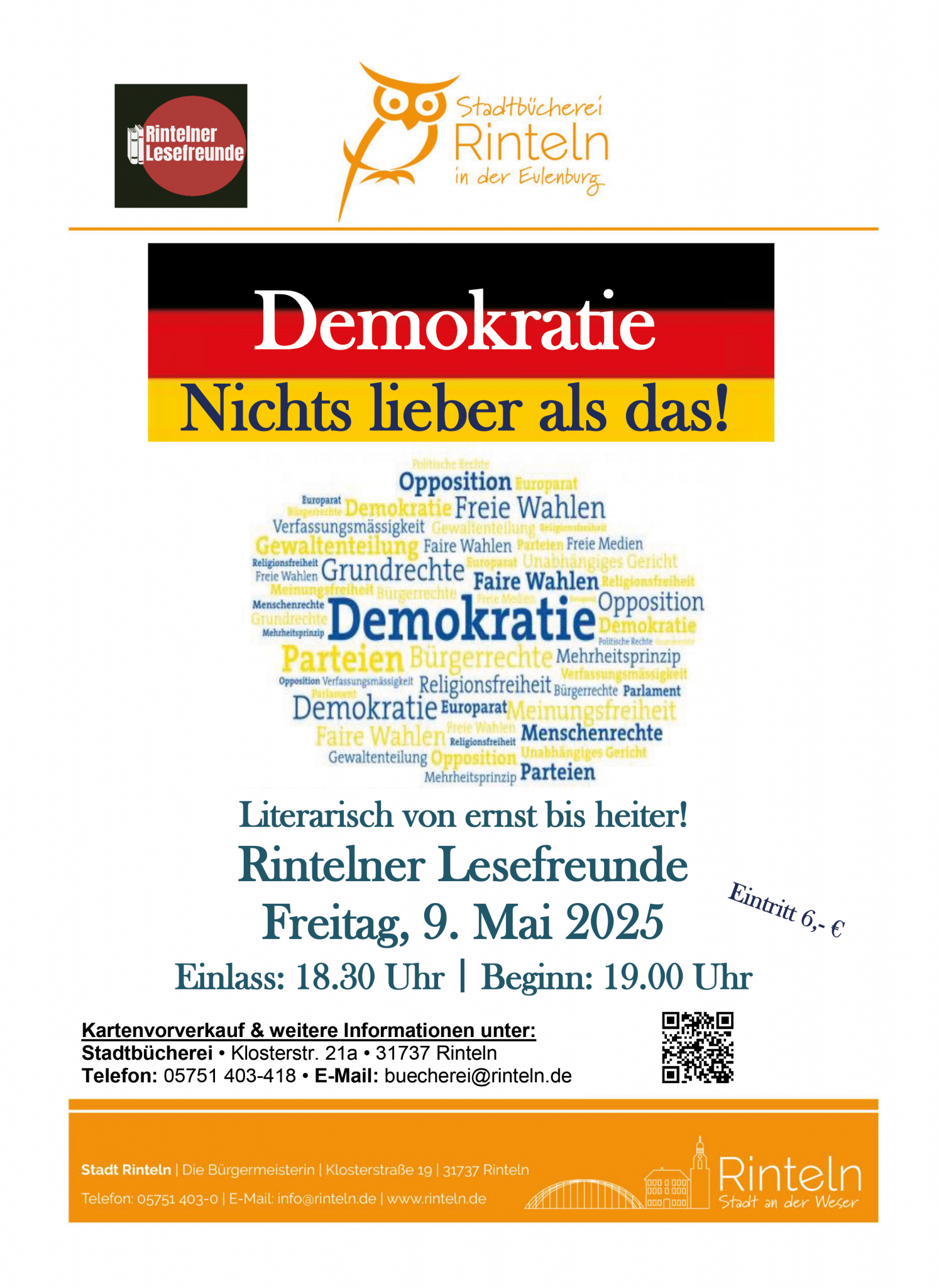 Die Rintelner Lesefreunde beleuchten das Thema Demokratie auf ihre eigene Weise: kritisch, satirisch, nachdenklich - und immer unterhaltsam. Das stellen sie mit ihrem neuen Programm unter Beweis, das am Freitag, 9. Mai um 19 Uhr in der Stadtbücherei Rinteln zu sehen sein wird.