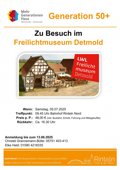 Ein Ausflug der besonderen Art erwartet Groß und Klein am Samstag, dem 05.07.2025.Die „Generation 50+“ fährt gemeinsam mit der Stadtjugendpflege ins Freilichtmuseum nach Detmold.