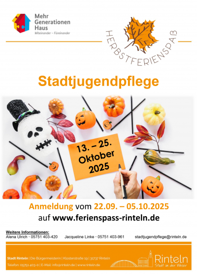 Langeweile in den Herbstferien? Garantiert nicht in Rinteln. Der Herbstferienspaß der Stadtjugendpflege lässt in der schulfreien Zeit keine Langeweile aufkommen. Die ganzen Herbstferien lang gibt es ein abwechslungsreiches Programm gefüllt mit jeder Menge Spiel, Spaß und Aktionen.