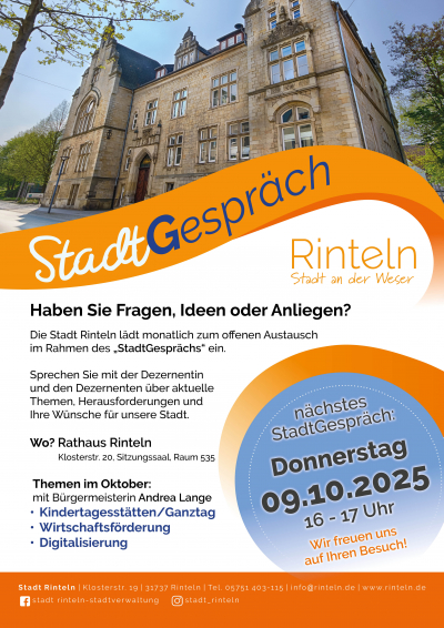 Am Donnerstag, den 09. Oktober 2025, findet von 16:00 bis 17:00 Uhr das nächste „StadtGespräch“ im Sitzungssaal des Rathauses, Raum 535, Klosterstraße 20, statt.