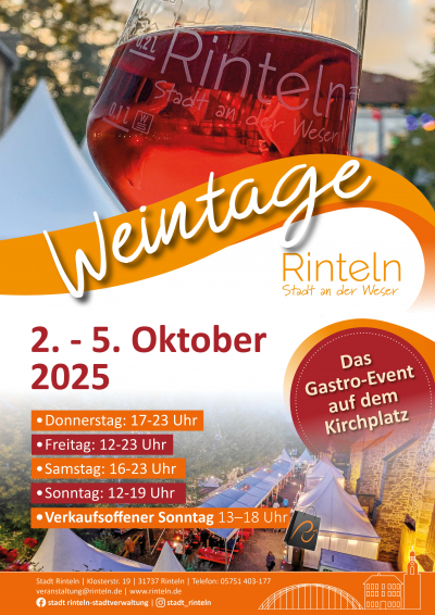 Die Stadt Rinteln lädt alle Weinliebhaberinnen und Weinliebhaber zu einem ganz besonderen Event ein: Die Rintelner Weintage finden vom 2. bis 5. Oktober auf dem malerischen Kirchplatz statt.