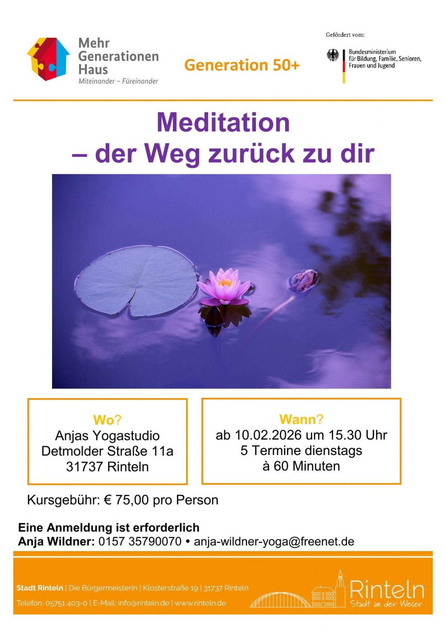 Das Mehrgenerationenhaus und die Generation 50+ bieten erstmalig gemeinsam mit Anja Wildner einen 5-wöchigen Meditationskurs an.
