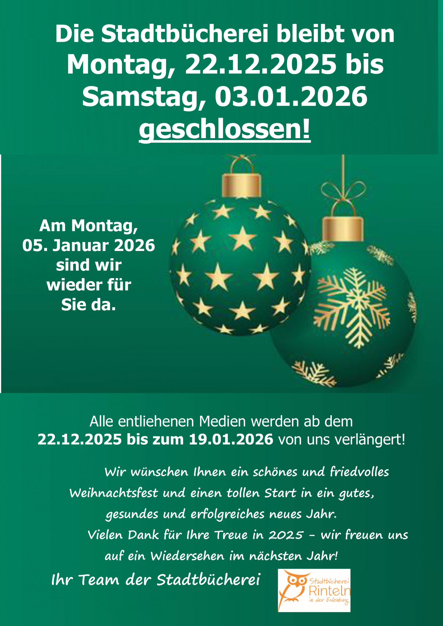 Dann geht die Bücherei in die Weihnachtspause und bleibt vom 22.12.2025 bis zum 03.01.2026 geschlossen. Ab Montag, den 5. Januar ist die Bücherei wieder zu den gewohnten Zeiten geöffnet.