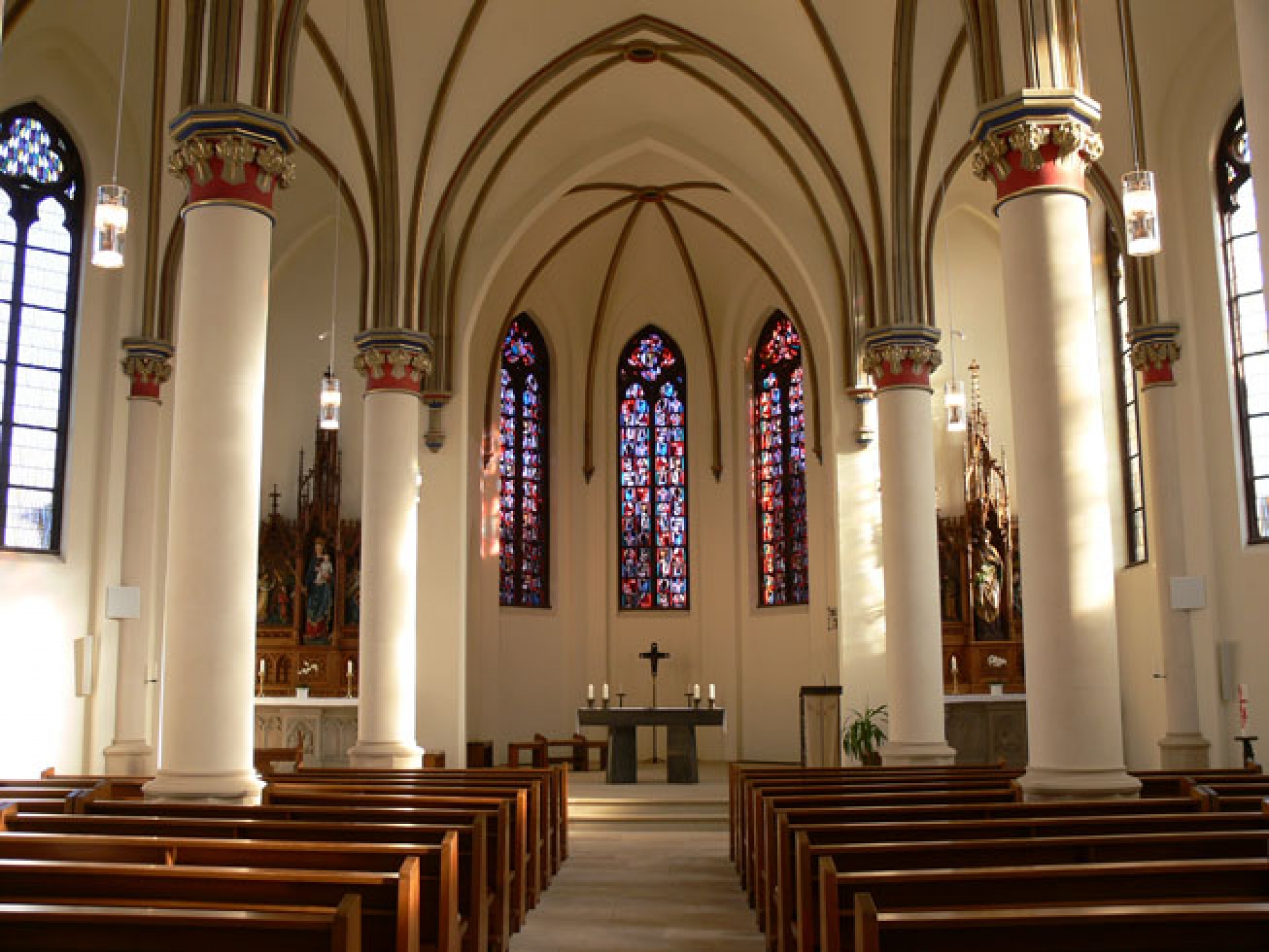 Anfang der 60er Jahre wurde das Kircheninnere neu gestaltet: vier Bergkristalle am Standkreuz und Tabernakel symbolisieren die vier Evangelisten. Die neugotischen Schnitzaltäre sind Maria und Josef gewidmet.