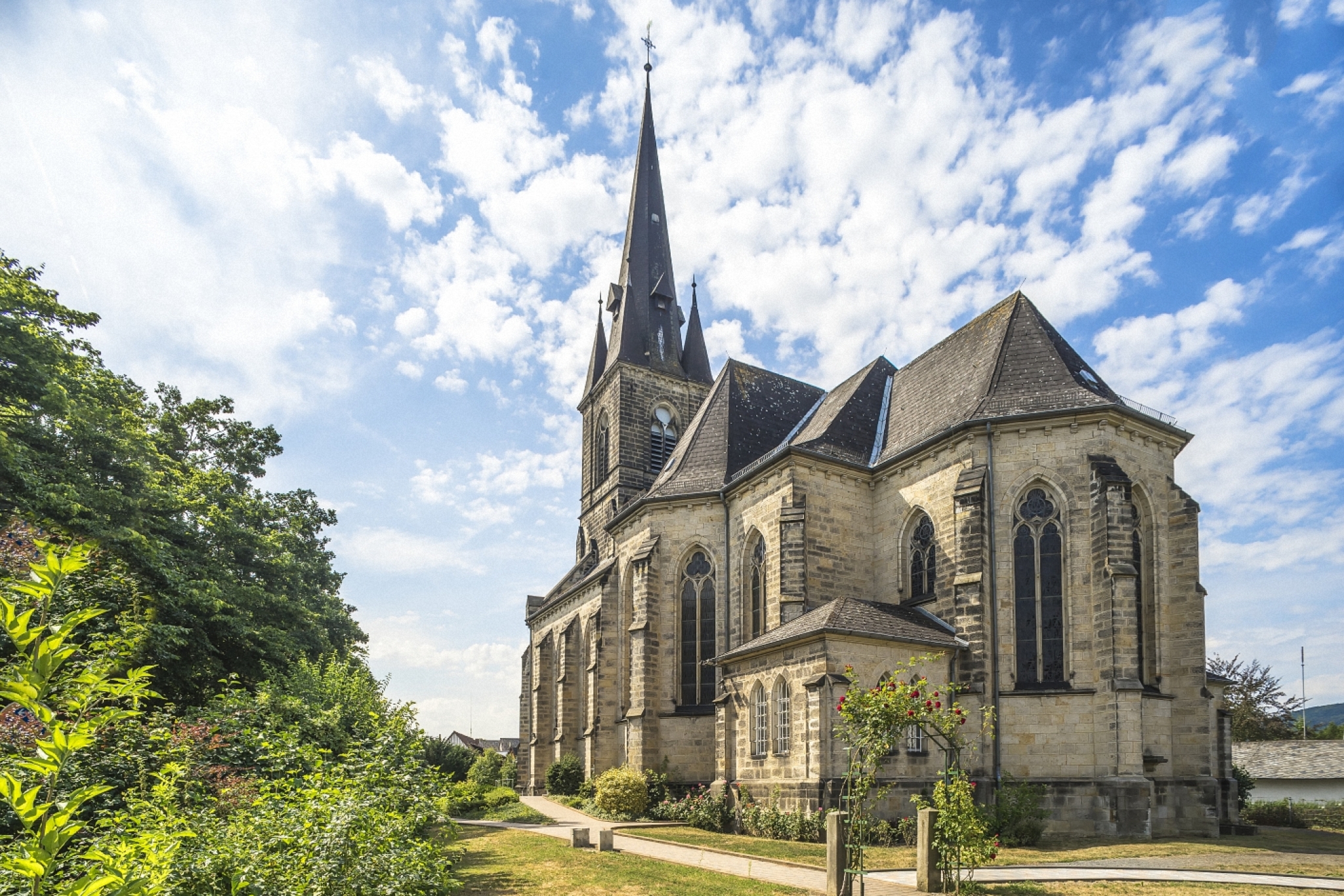 Der neugotische Bau aus Obernkirchener Sandstein mit vorgesetztem 51m hohem Turm wurde 1888 durch den Bischof von Fulda geweiht.
