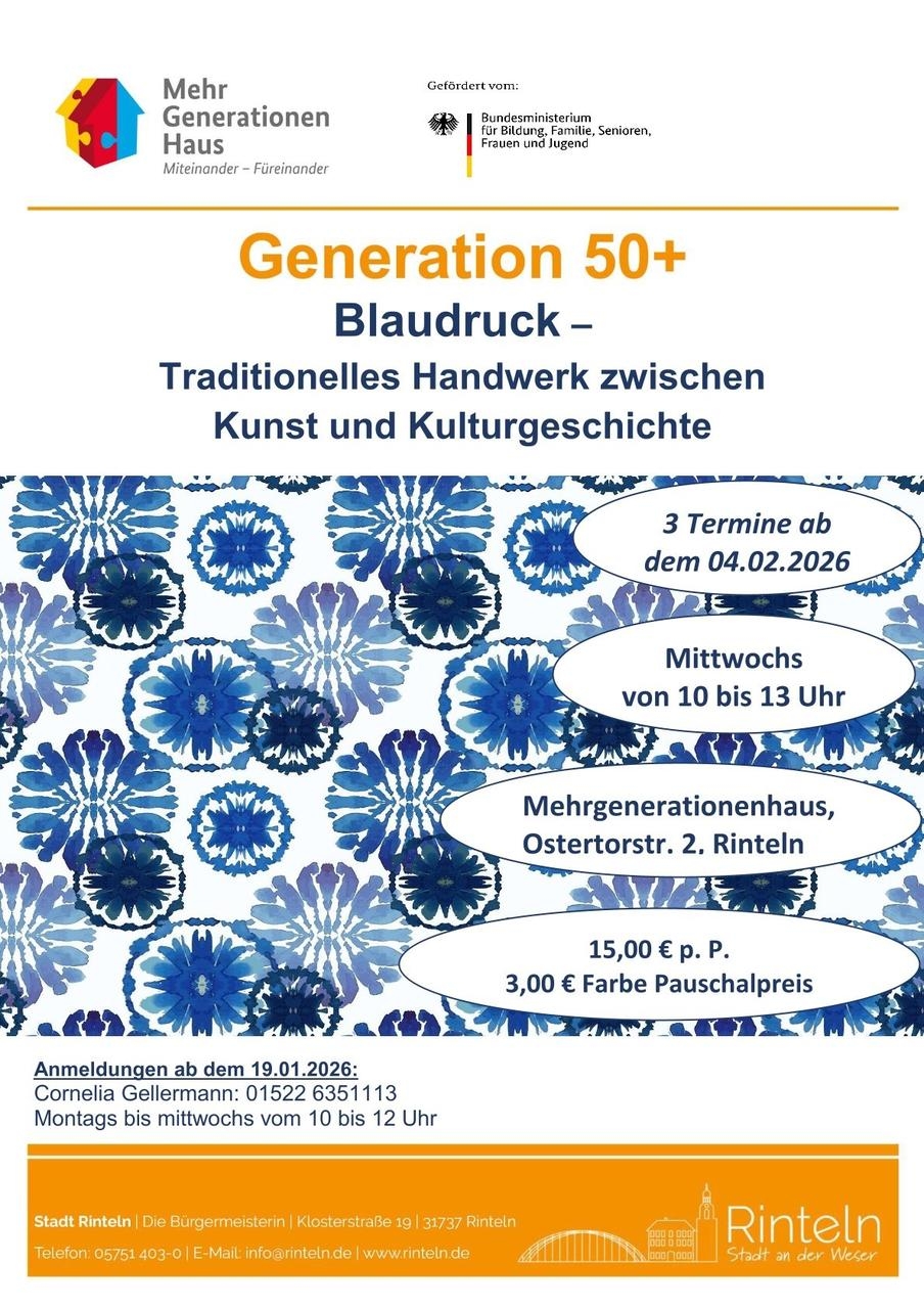 Frau Cornelia Gellermann und die "Generation 50+" laden dich herzlich ein zu einer besonderen Reise in die faszinierende Blaudruckwelt.