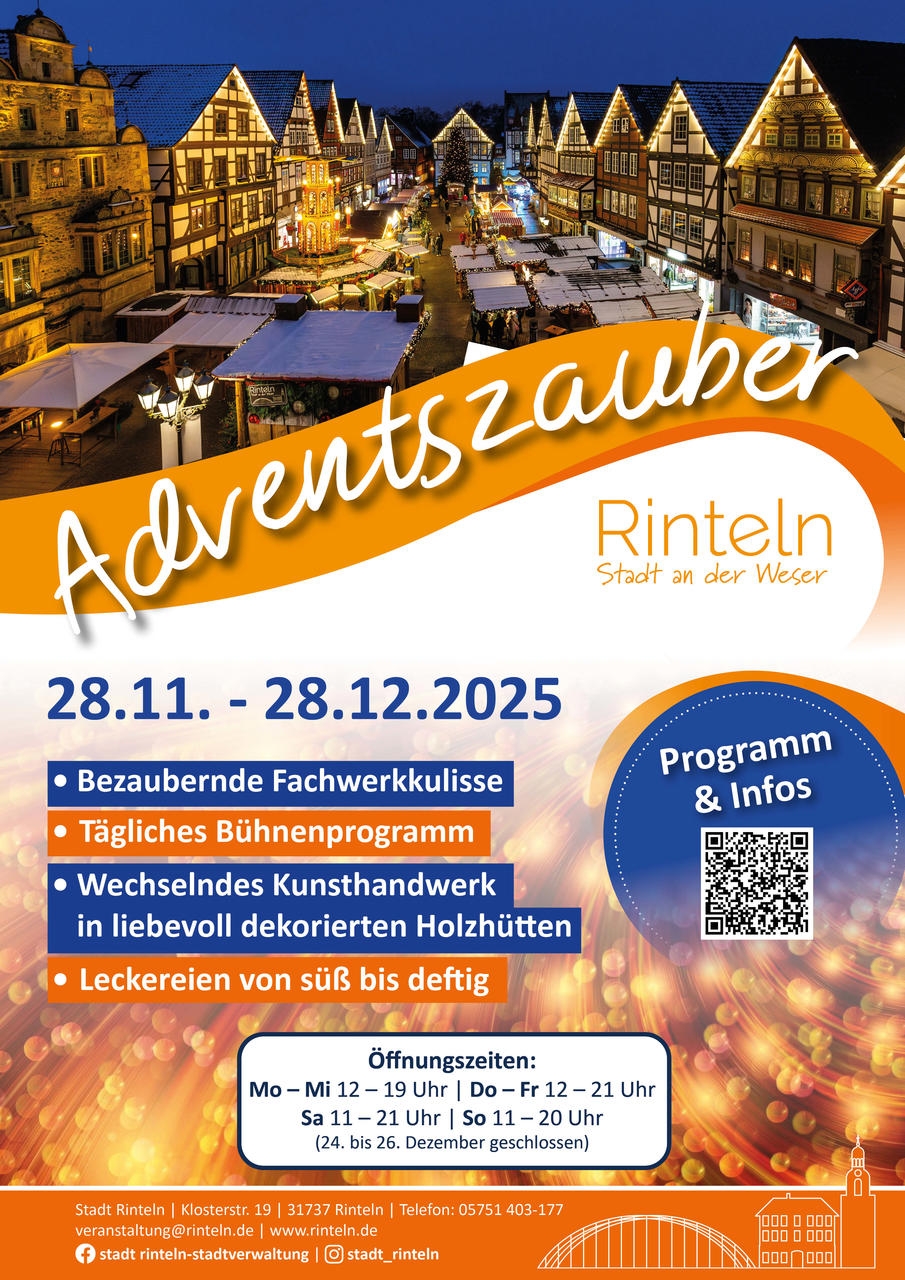 Vom 28. November bis zum 28. Dezember 2025 verwandelt sich der Rintelner Marktplatz in ein stimmungsvolles Budendorf mit liebevoll dekorierten Häuschen. Hier finden Sie verschiedenstes Kunsthandwerk, wunderschöne Geschenkideen und für das leibliche Wohl ist natürlich auch gesorgt.