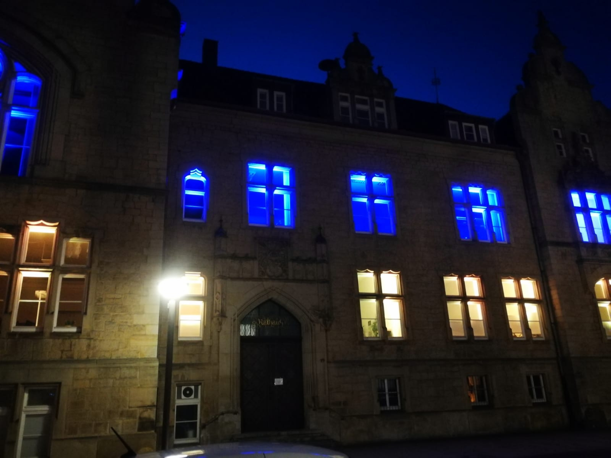 Rinteln zeigt sich solidarisch mit der Ukraine: Anlässlich des Krieges in der Ukraine leuchtet das Rathaus der Stadt Rinteln seit dem 28. Februar in den Farben der ukrainischen Nationalflagge Blau und Gelb.