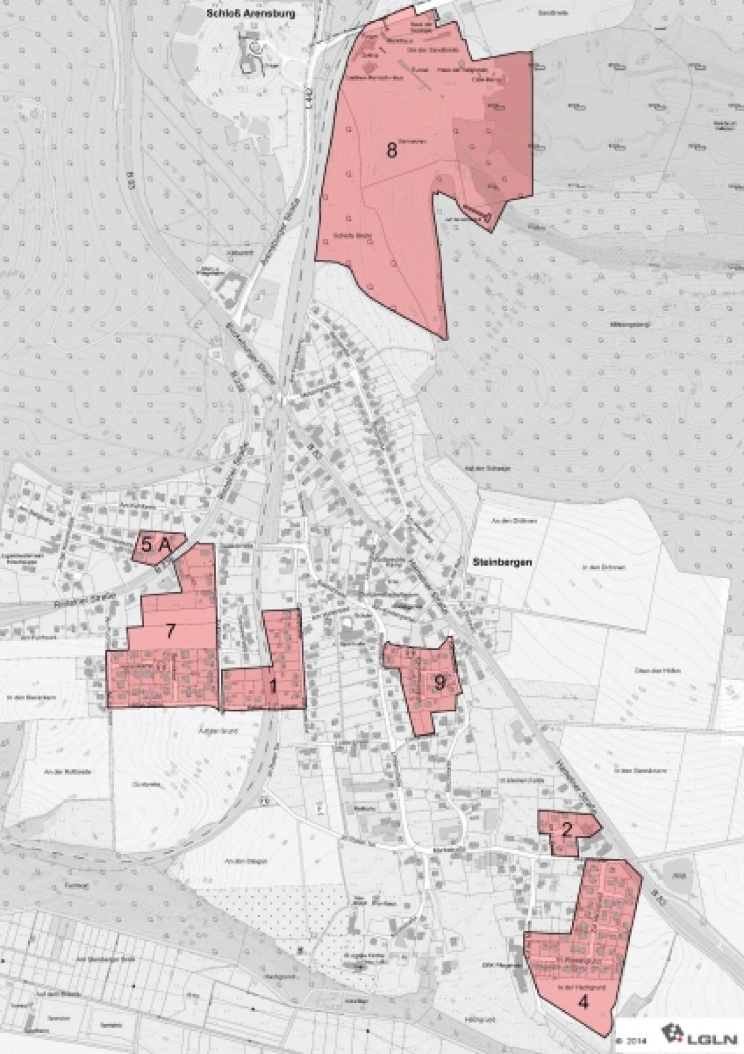 In der Grafik sind die Geltungsbereiche der Bebauungspläne vom Ortsteil Steinbergen dargestellt. Klicken Sie auf auf die Grafik um die Karte zu vergrößern bzw. um heranzuzoomen.