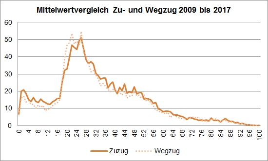 In der Bevölkerungsbewegung nach Alter zeigt sich, dass der tatsächliche Wanderverlust in der Altersgruppe der 18 bis 25-Jährigen liegt.
