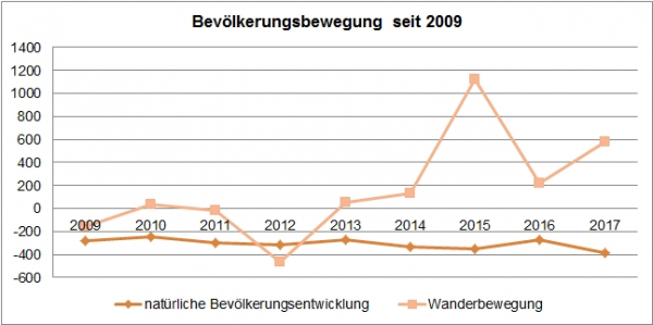 Die Statistik zur Bevölkerungsbewegung zeigt, dass der Saldo der Geburten und Sterbefälle seit 2006 negativ war. Der Wandersaldo ist hingegen seit 2013 positiv. Darin liegt der Grund für die jeweilige Einwohnerzahl zum Stichtag 31. Dezember.