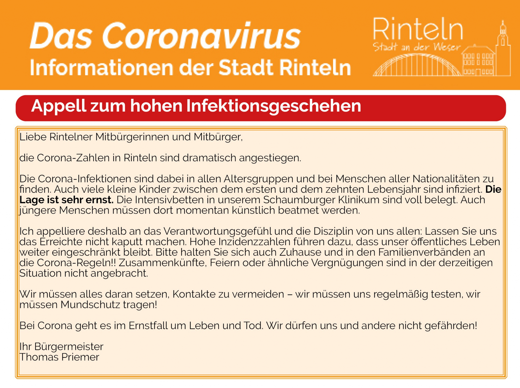 Aufgrund der aktuellen Infektionslage wendet sich Bürgermeister Thomas Priemer im 16. Informationsflyer mit einem in sechs Sprachen verfassten Appell an alle Bürgerinnen und Bürger der Stadt Rinteln: