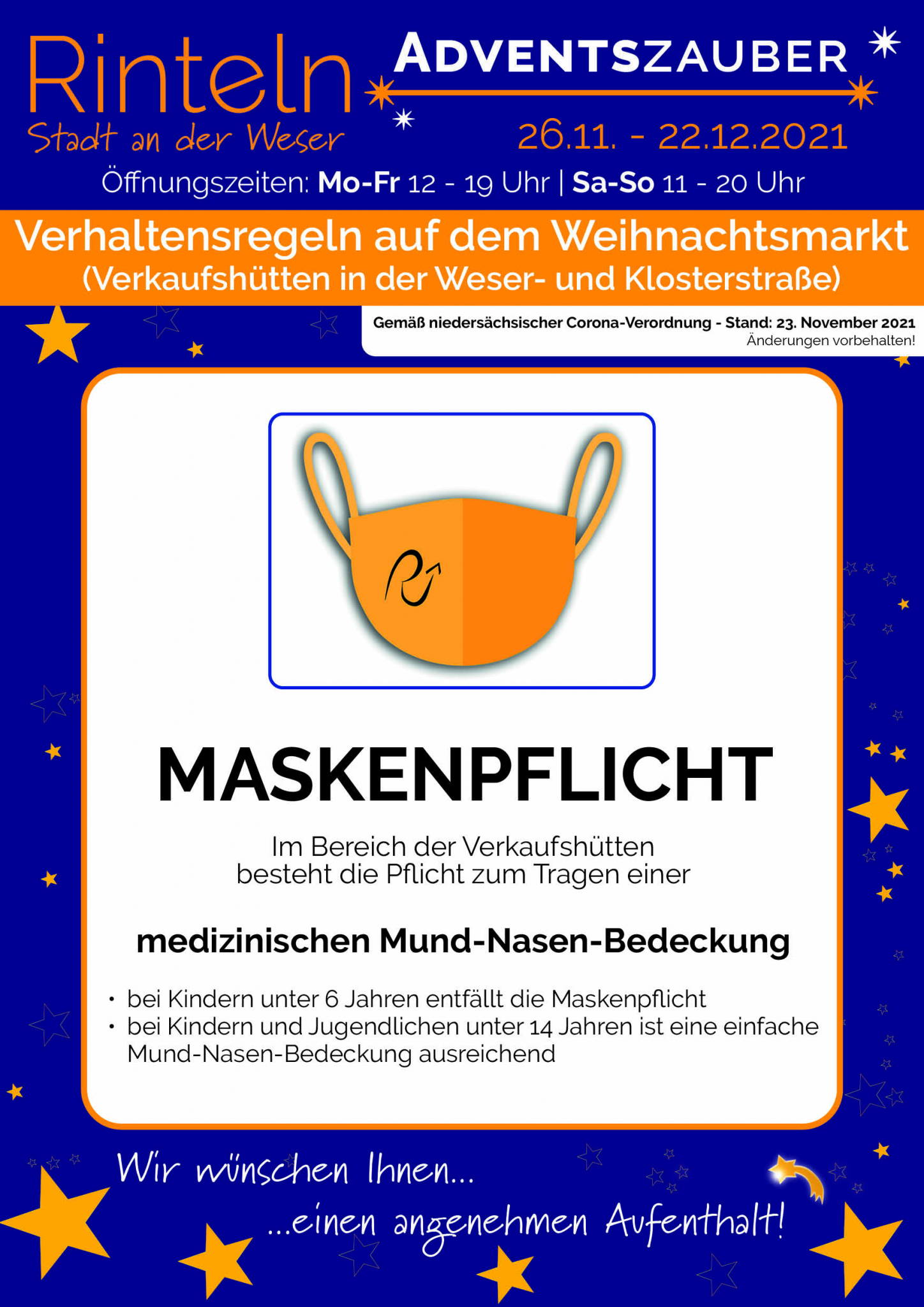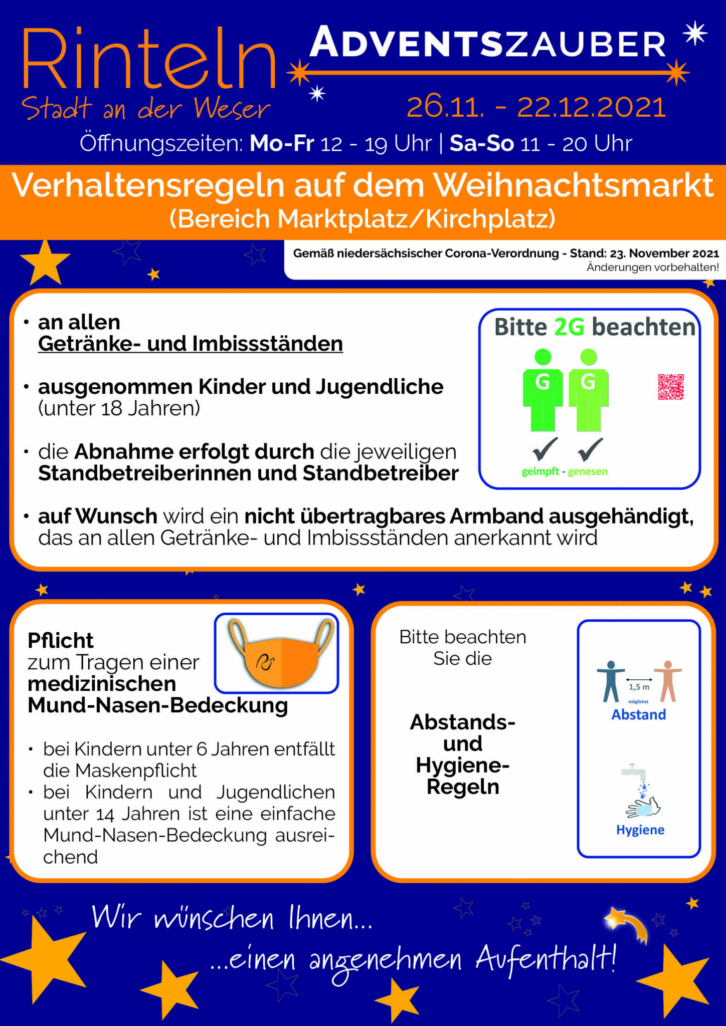 Die Entscheidung in diesem Jahr einen Weihnachtsmarkt in Rinteln durchzuführen, ist gemeinsam zwischen der Stadt, den Standbetreibern und dem Stadtmarketingverein Pro Rinteln getroffen worden. Der Weihnachtsmarkt findet unter den aktuellen Regeln der Niedersächsischen Corona Verordnung statt. Demnach gilt ab Eröffnung zunächst die 2-G-Regel an allen Getränke- und Imbissständen. Die Besucherinnen und Besucher müssen also geimpft oder genesen sein. Der entsprechende Nachweis wird mit der Bestellung an den jeweiligen Ständen kontrolliert. Besucherinnen und Besucher können sich dann ein Armbändchen aushändigen lassen. Damit ist bei der nächsten Bestellung eine erneute Kontrolle nicht notwendig. Kinder und Jugendliche bis 18 Jahren sind von dieser Regelung ausgenommen. Hinweise auf die für den Weihnachtsmarkt aktuell geltenden Corona-Regeln werden auf dem Marktgelände ausgewiesen und unter www.rinteln.de veröffentlicht.