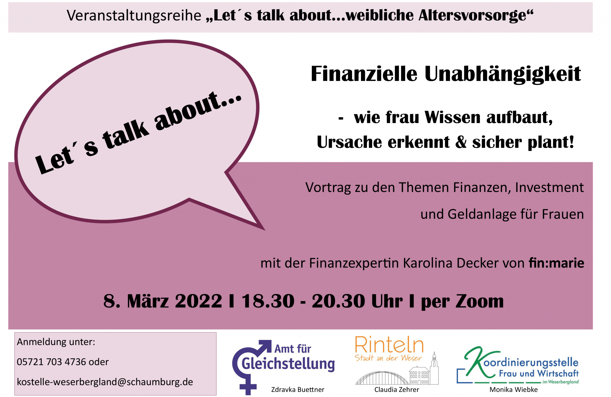 Organisiert wird die Veranstaltung "Let´s talk about… finanzielle Unabhängigkeit von Frauen" im Rahmen der vierteiligen Veranstaltungsreihe "Let´s talk about ….. weibliche Altersvorsorge" von der Gleichstellungsbeauftragten des Landkreise Schaumburg, Zdravka Buettner, der Gleichstellungsbeauftragen der Stadt Rinteln, Claudia Zehrer und der Projektleitung der Koordinierungsstelle Frau und Wirtschaft, Monika Wiebke.