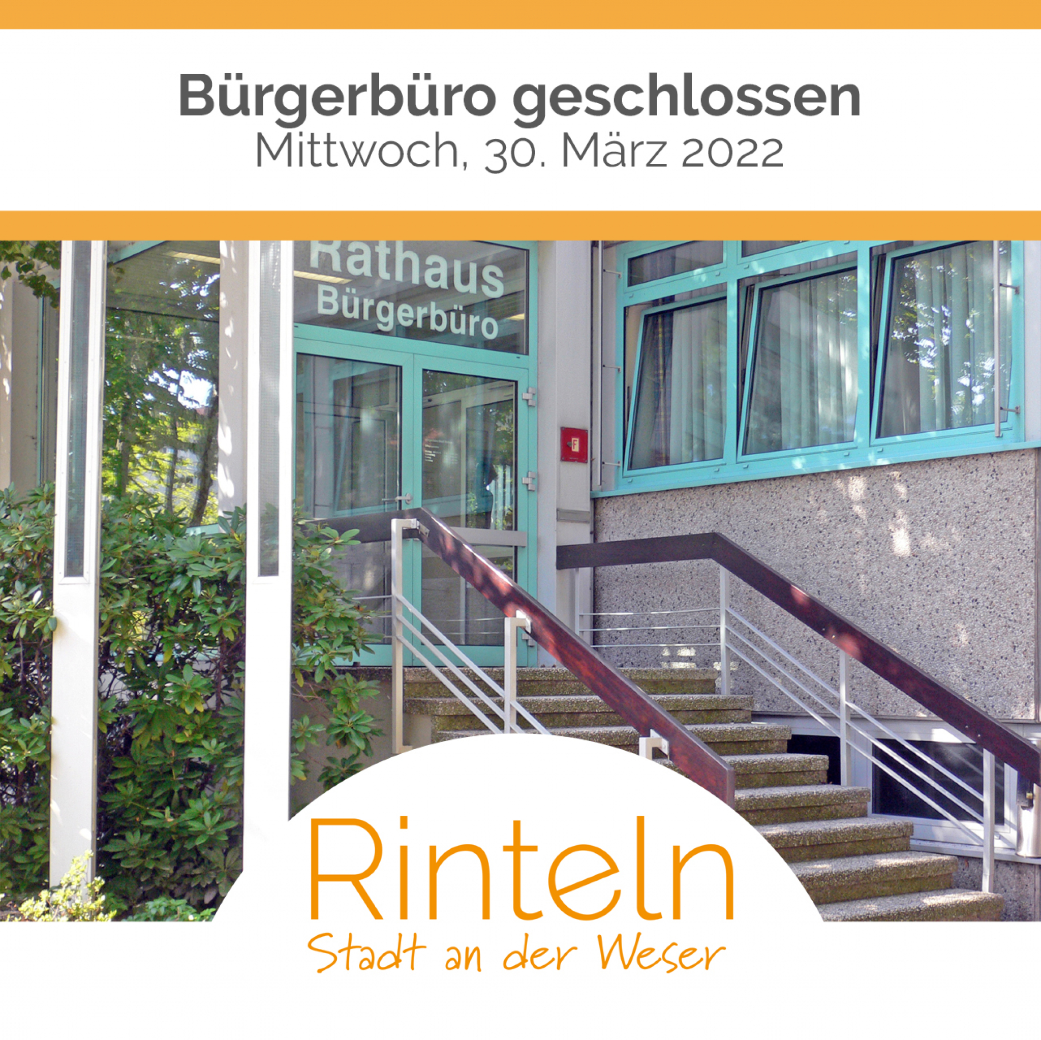 Am Mittwoch, 30.03.2022, bleibt das Bürgerbüro der Stadt Rinteln aufgrund eines umfangreichen Software-Updates für den Publikumsverkehr ganztägig geschlossen.