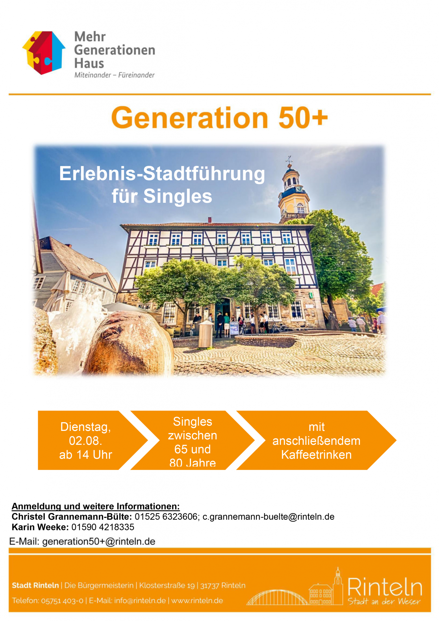 Entdecken Sie Rinteln (ganz neu)! Gehen Sie einmal mit anderen Augen durch unsere schöne Fachwerkstadt an der Weser und lernen Sie – neben der spannenden Stadtgeschichte – neue Menschen kennen. Die Stadtführung mit einem erfahrenen Stadtführer findet für Singles der Altersklasse 65 Jahre bis 80 Jahre statt.