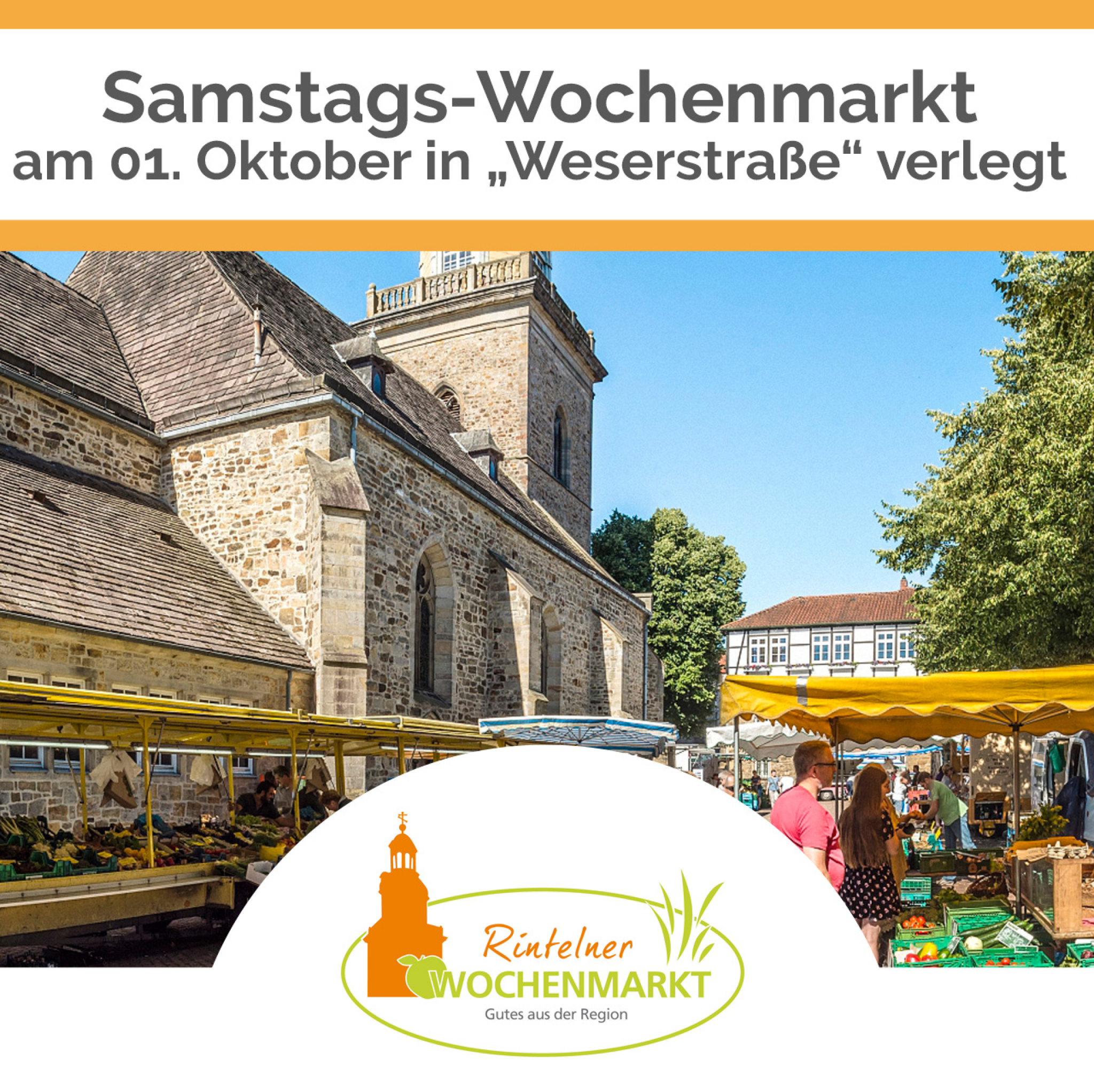 Aus diesem Grund wird der Samstags-Wochenmarkt am 01. Oktober 2022 in die Weserstraße und auf den Marktplatz verlegt. Der Parkplatz auf dem Kirchplatz kann an diesem Tag trotzdem für den Wochenmarkt-Einkauf genutzt werden.