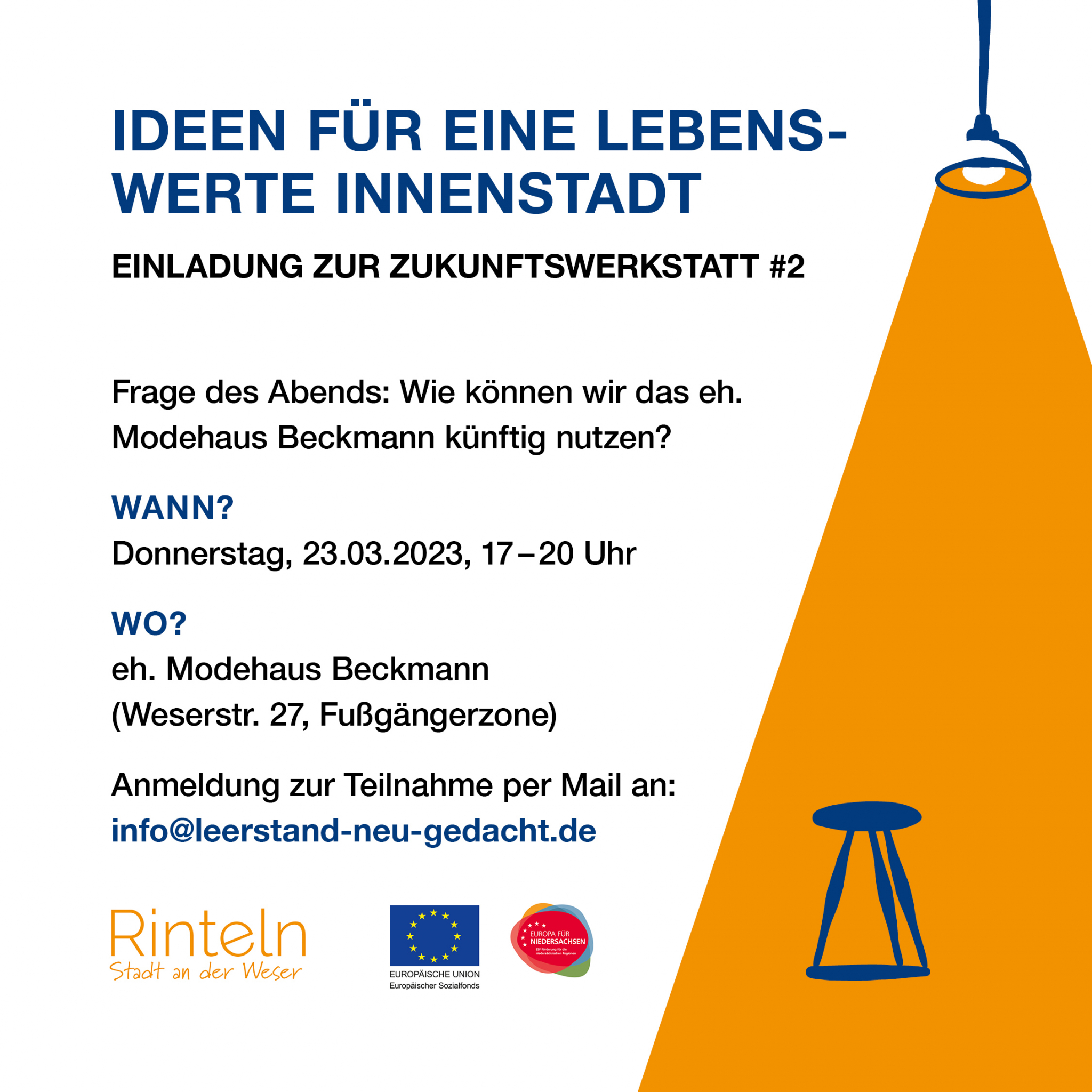 Die weiteren Workshops sind für den 23. März und 27. April (jeweils 17-20 Uhr) geplant. Dazu sind Interessierte sowie mögliche Gründer und Gründerinnen eingeladen. Ziel ist es, Modelle für eine Nutzungsperspektive insbesondere des ehemaligen Modehaus' Beckmann zu finden. Die Ergebnisse werden bei der Abschlussveranstaltung am 11. Mai der Öffentlichkeit präsentiert.