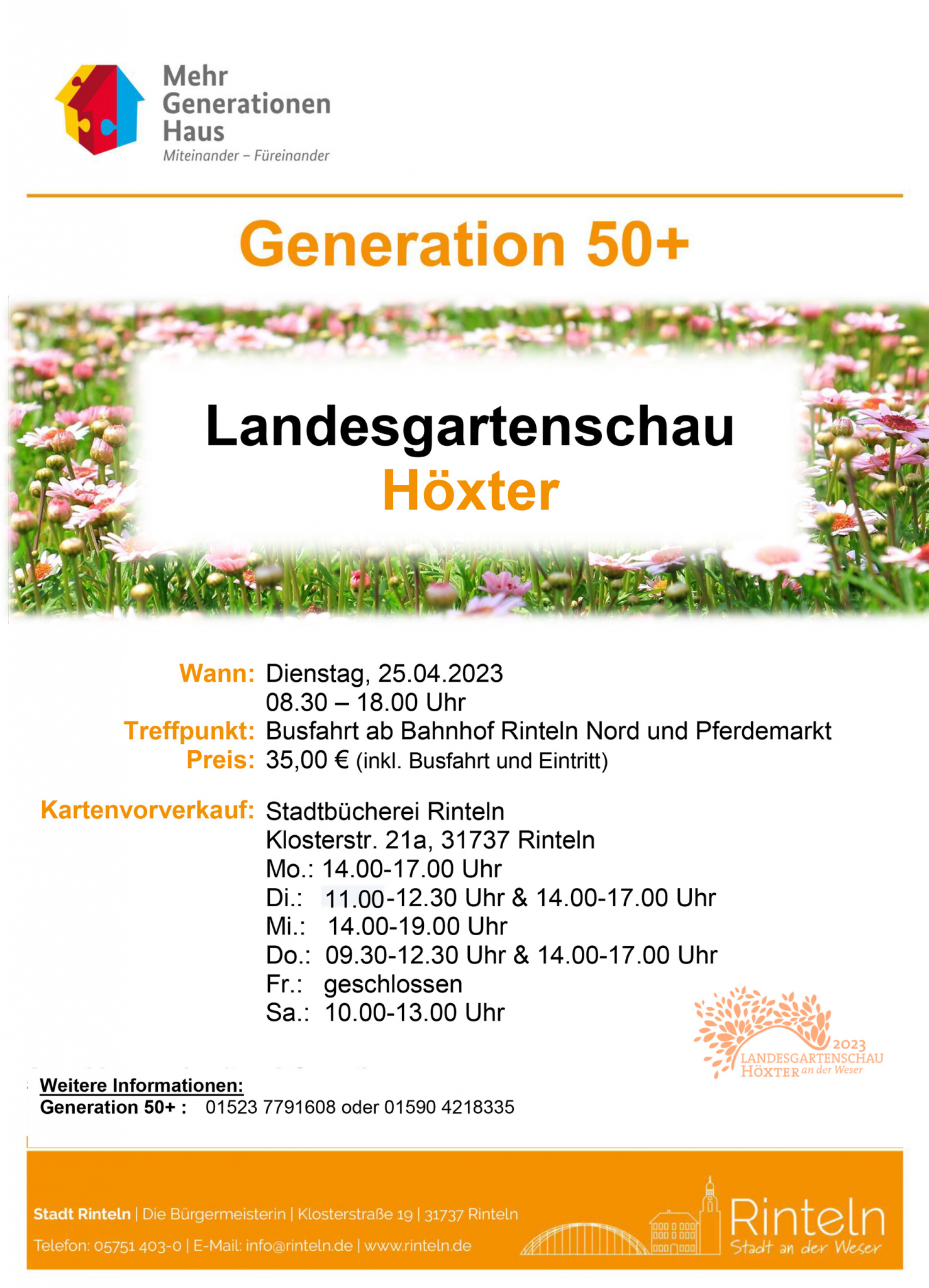 Das Team der Generation 50+ der Stadt Rinteln bietet in Kooperation mit dem Obst- und Gartenbauverein Rinteln eine Tagesfahrt zur Landesgartenschau an. Der Kartenvorverkauf startet ab sofort.