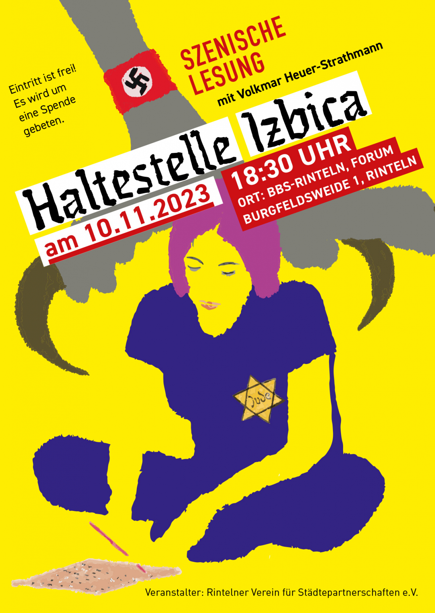 Am Freitag den 10. November 2023 wird auf Initiative des Rintelner Vereins für Städtepartnerschaften e.V. der Autor des Stücks "Haltestelle Izbica" Volkmar Heuer-Strathmann eine szenische Lesung mit Musik zu seinem Stück in Rinteln durchführen.