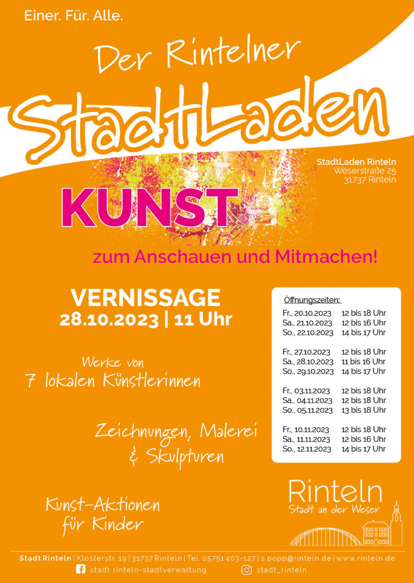 Am zweiten Aktionswochenende findet am Samstag, den 28. Oktober 2023, um 11 Uhr eine Vernissage bei kleinen Leckereien und Plausch statt, zu der alle Rintelnerinnen und Rintelner und Besucher der Innenstadt herzlich eingeladen sind.