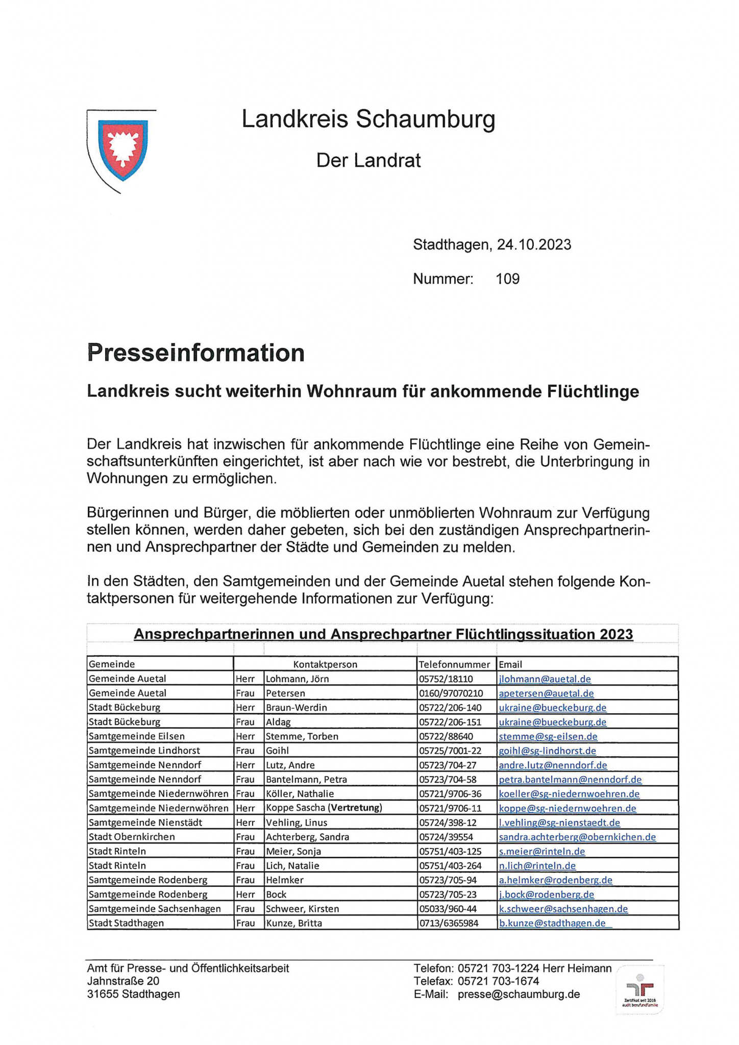 In den Städten, den Samtgemeinden und der Gemeinde Auetal stehen folgende Kontaktpersonen (siehe beigefügte Pressemitteilung des Landkreises) für weitergehende Informationen zur Verfügung: