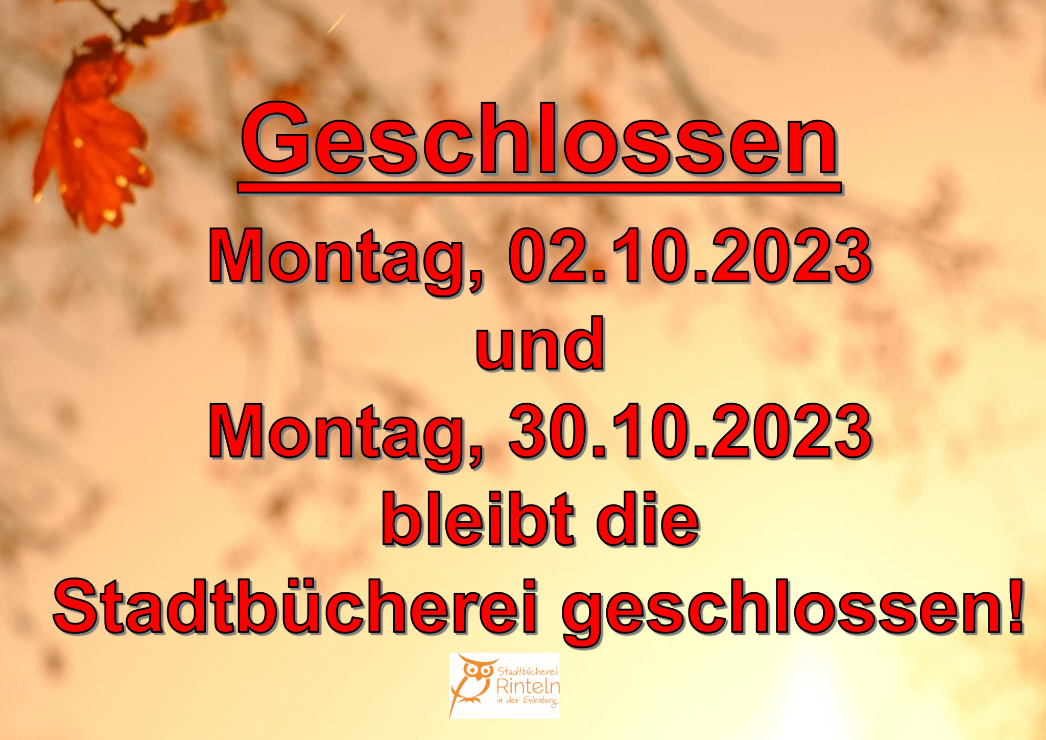 Die Stadtbücherei bleibt am Montag, 30. Oktober 2023, und am Reformationstag, Dienstag, 31. Oktober, geschlossen. Am Mittwoch, 1. November, öffnet die Bücherei wie gewohnt ab 14.00 Uhr.