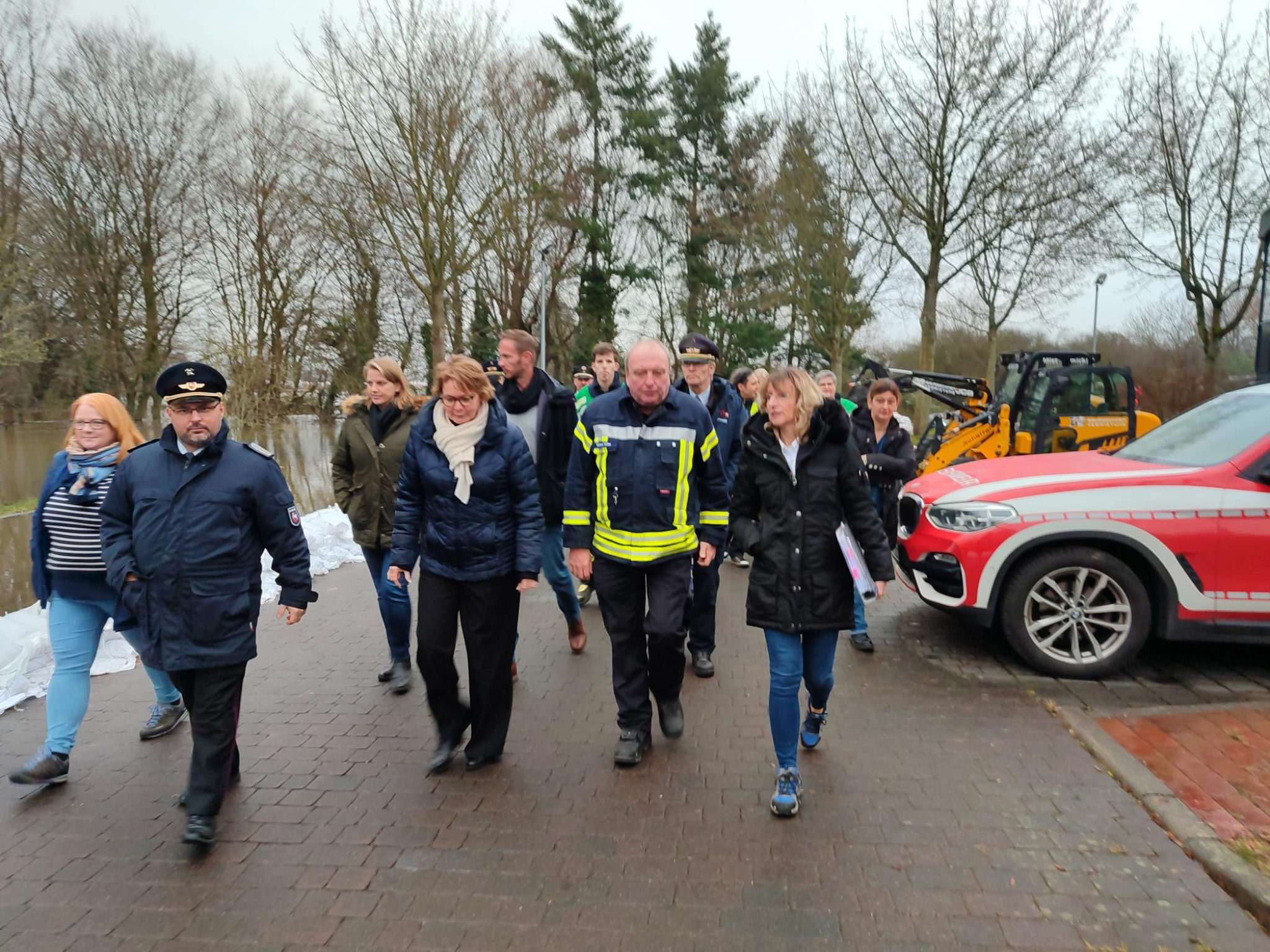 In Anwesenheit von zahlreichen Medienvertretern bedankte sich die Bürgermeisterin bei den Einsatzkräften und dem Land Niedersachsen für die bisherige Unterstützung und warb für Förderungen für den Hochwasserschutz.