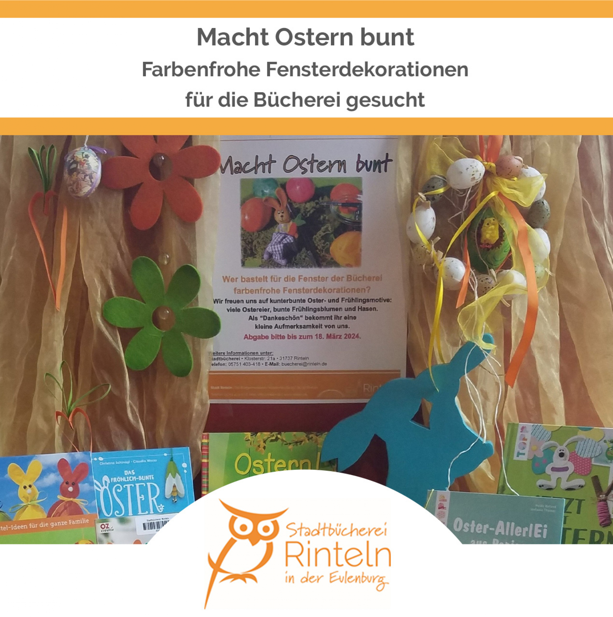 Die Stadtbücherei Rinteln startet in den Frühling. Damit die Fenster in der Bücherei zu Ostern schön bunt werden, sind alle Kinder aufgerufen bei der Dekoration mitzuhelfen und eine Kleinigkeit zu basteln. Gesucht werden Osterhasen, bunte Eier, wollige Schäfchen, kleine Hühner oder farbenfrohe Frühlingsblumen.