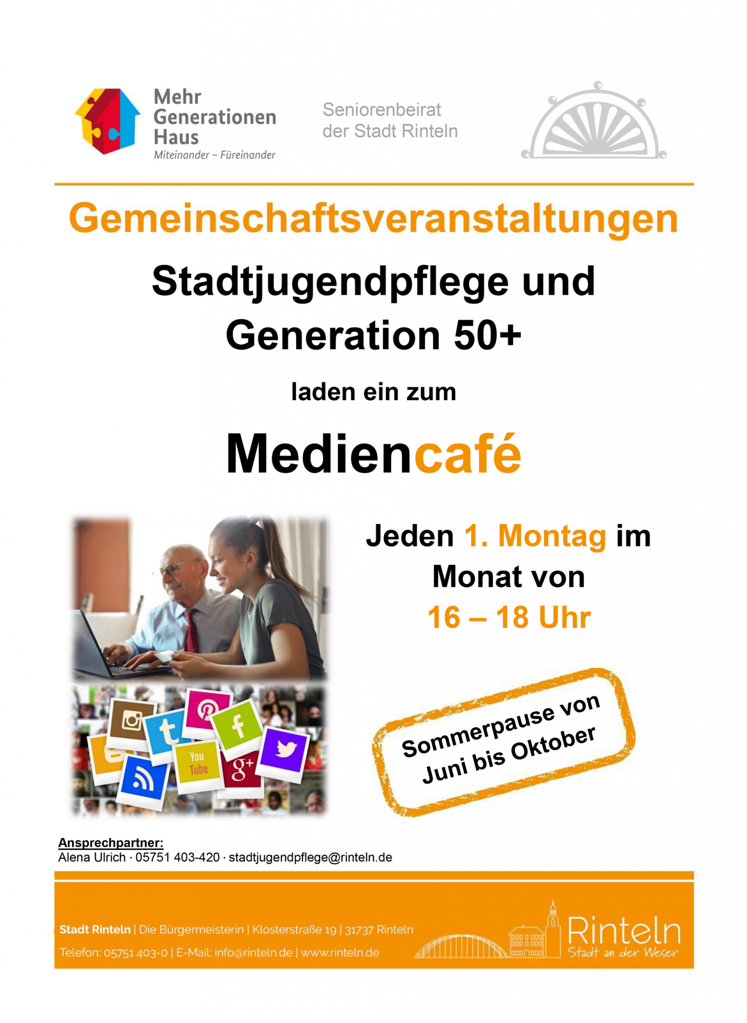 Die Stadtjugendpflege und die „Generation 50+“, begleitet durch die Stiftung für Rinteln, haben mit dem „Mediencafé“ einen Rahmen geschaffen, in dem in entspannter Atmosphäre viele Fragen rund um die Handynutzung, Internetzugänge und vieles mehr geklärt werden können. Fragen werden im Einzelfall geklärt und auf den Umgang mit den Medien wird individuell eingegangen. Den jungen Menschen, die mit dieser Technik groß geworden sind, ist keine Frage zu viel und sie teilen ihr Wissen rund um die Mediennutzung gerne mit der „Generation 50+“.