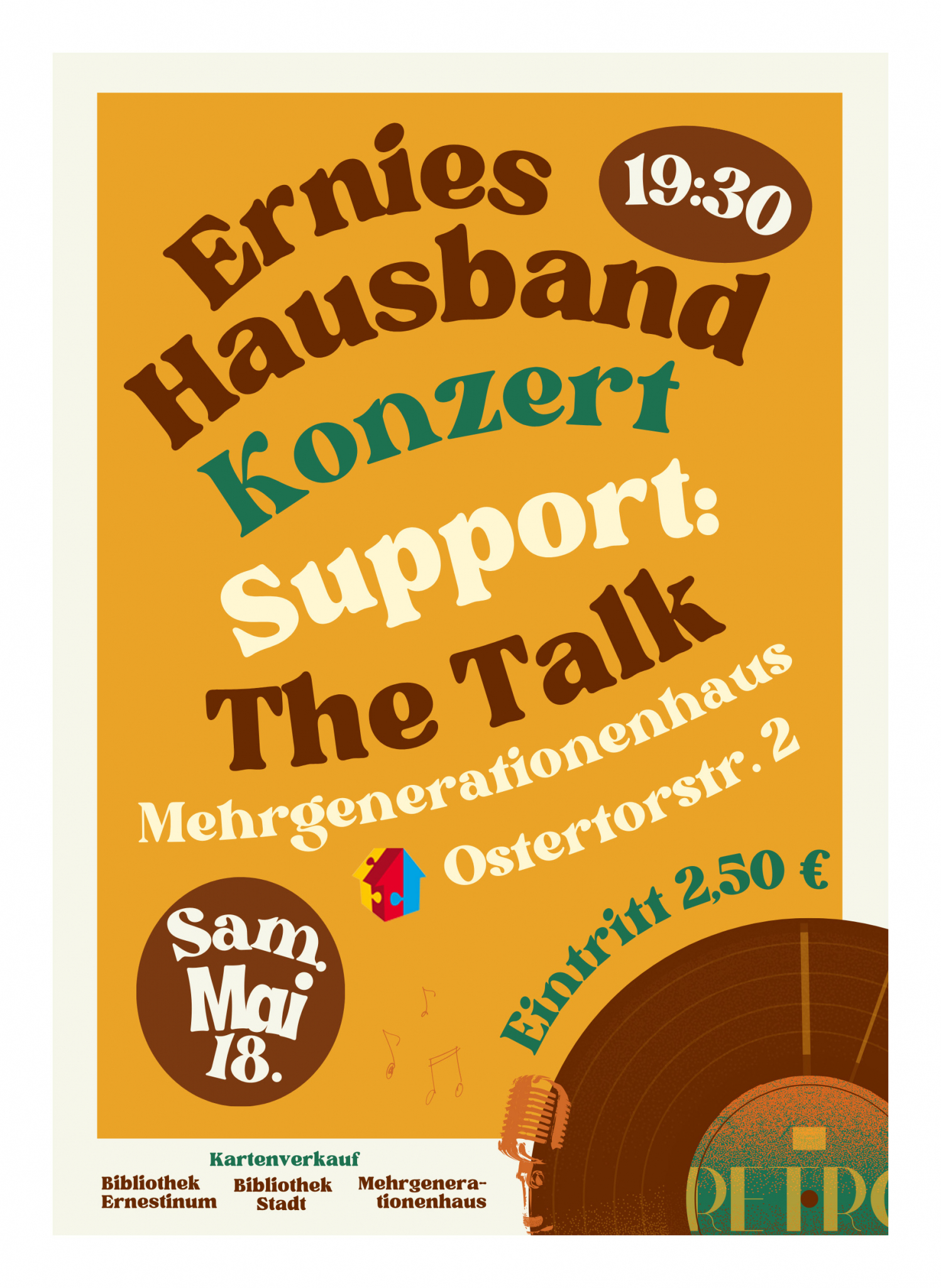 Ernies Hausband und The Talk spielen am 18. Mai 2024 im Mehrgenerationenhaus