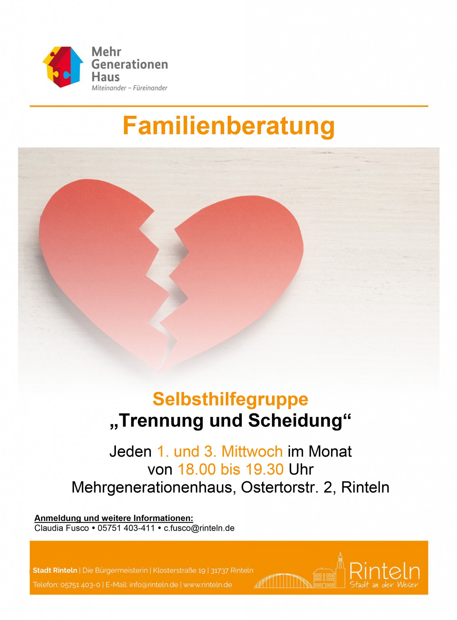 Die Selbsthilfegruppe „Trennung und Scheidung“ bietet Unterstützung in dieser aufwühlenden Zeit. Beim Informations- und Erfahrungsaustausch mit anderen Betroffenen finden Sie praktische Lebenshilfe sowie gegenseitige emotionale Unterstützung und Motivation.