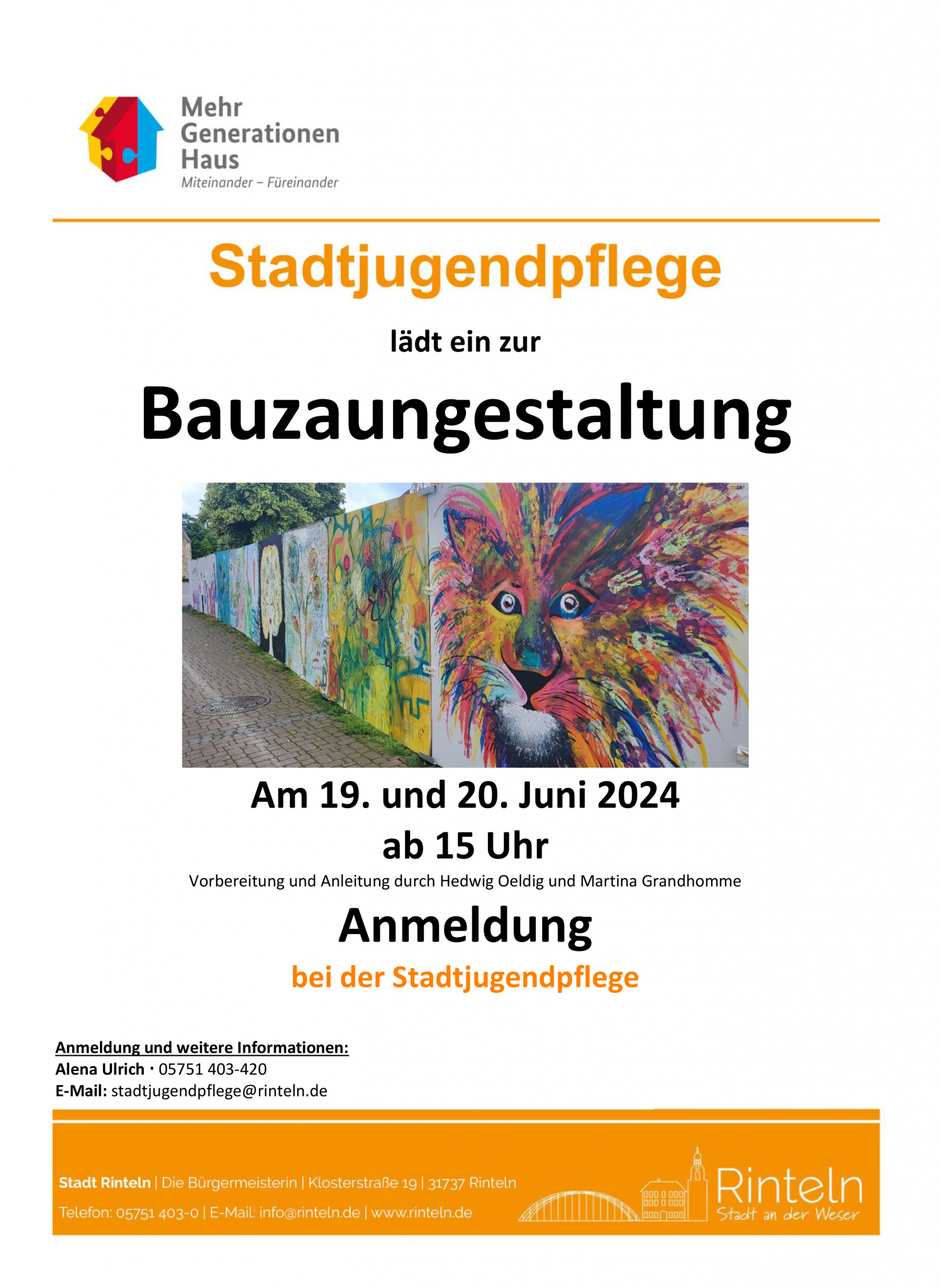 Begleitet werden die Aktionen von der Stadtjugendpflegerin Alena Ulrich. Alle Interessierten, die sich künstlerisch an der Verschönerung des Bauzauns in der Klosterstraße beteiligen möchten, können sich bei Alena Ulrich, stadtjugendpflege@rinteln.de, Tel. 05751 - 403420 melden.