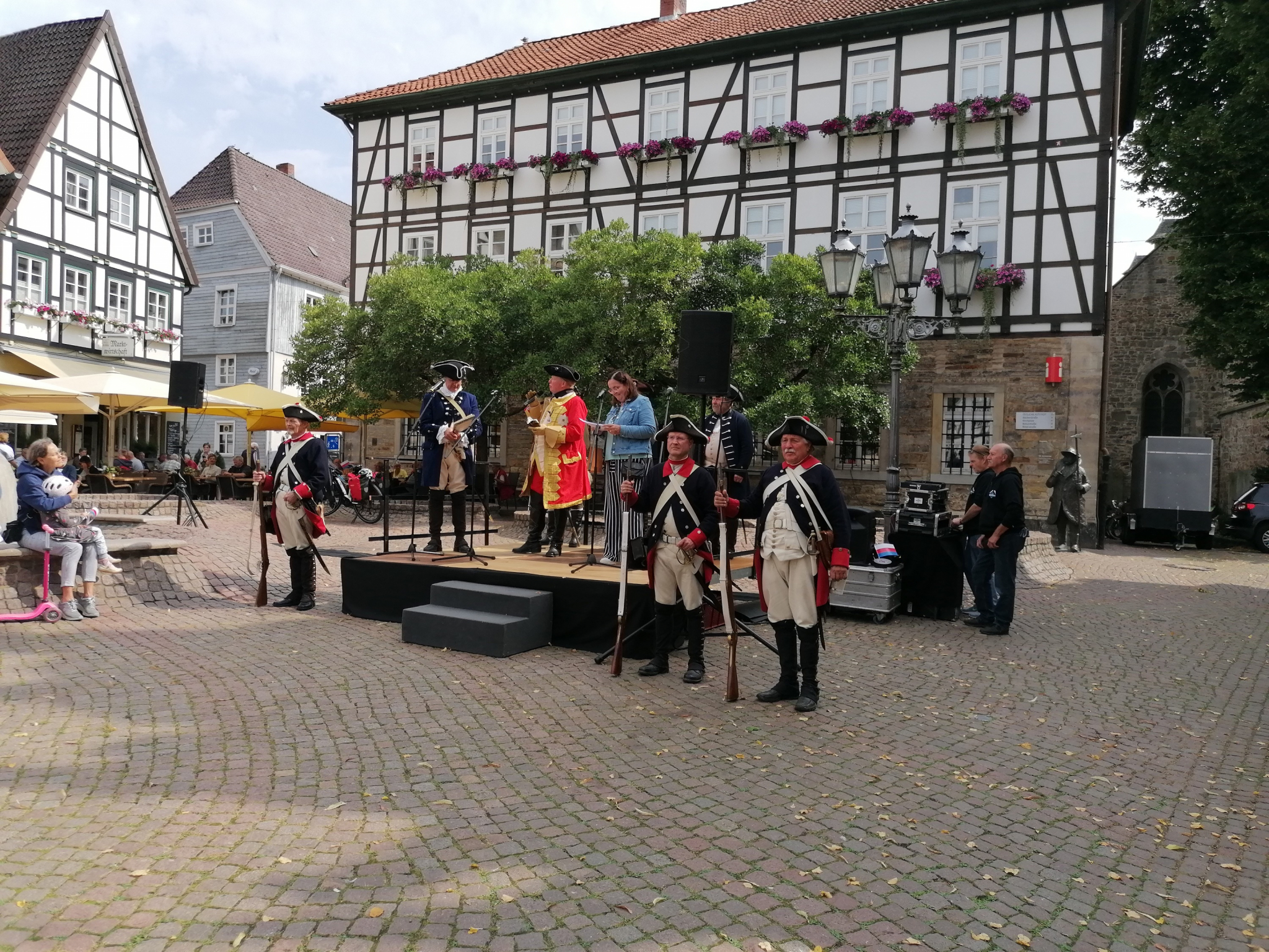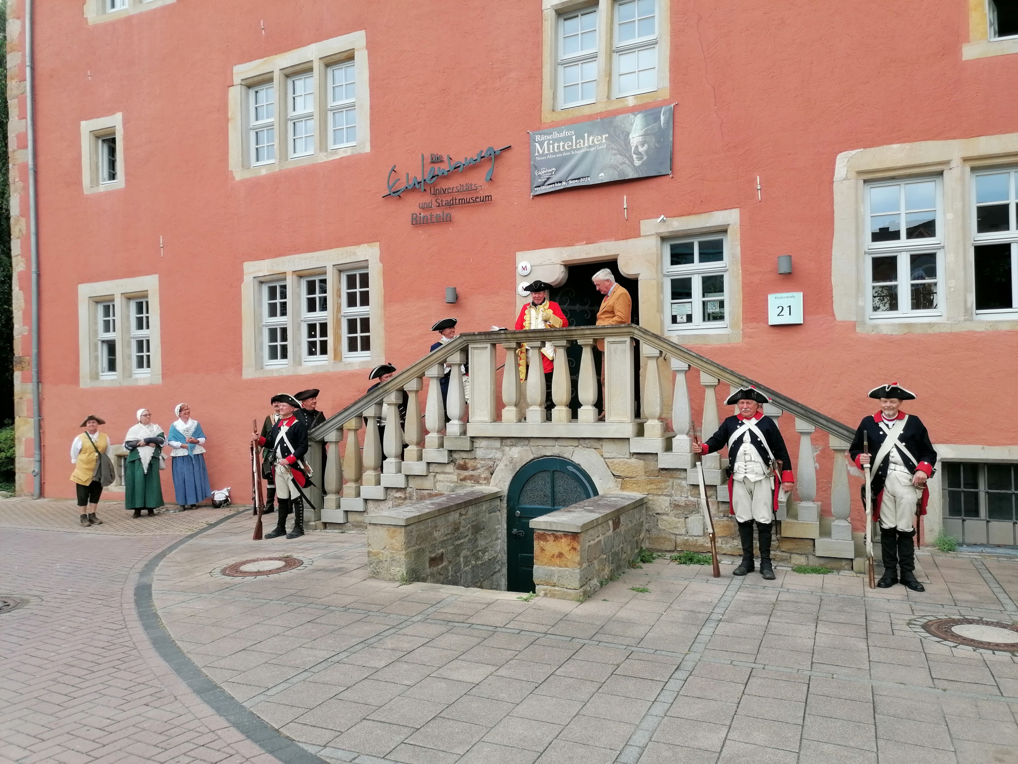 Der 300. Geburtstag von Graf Wilhelm zu Schaumburg-Lippe ist für die Schaumburger Landschaft Anlass, um in diesem Jahr an die vielseitige Persönlichkeit und die Verdienste dieses Landesherrn zu erinnern. Vom 30. August bis zum 1. September reiste der frühere Landesherr mit einer Abord-nung seines Infanterieregiments durch Schaumburg. Anders als bei früheren Inspektionen kehrte Graf Wilhelm allerdings nicht in die zweite Hälfte des 18. Jahrhunderts zurück, sondern traf bei seinem Einzug in den Städten und Dörfern Menschen des Jahres 2024 an. Am 31. August besuchte Graf Wilhelm zu Schaumburg-Lippe die Stadt Rinteln, die im 18. Jahrhundert zur hessischen Grafschaft gehört hatte. Um so erstaunter war der Graf zu hören, wie intensiv die beiden früheren Lan-desteile mittlerweile zusammengewachsen sind.
