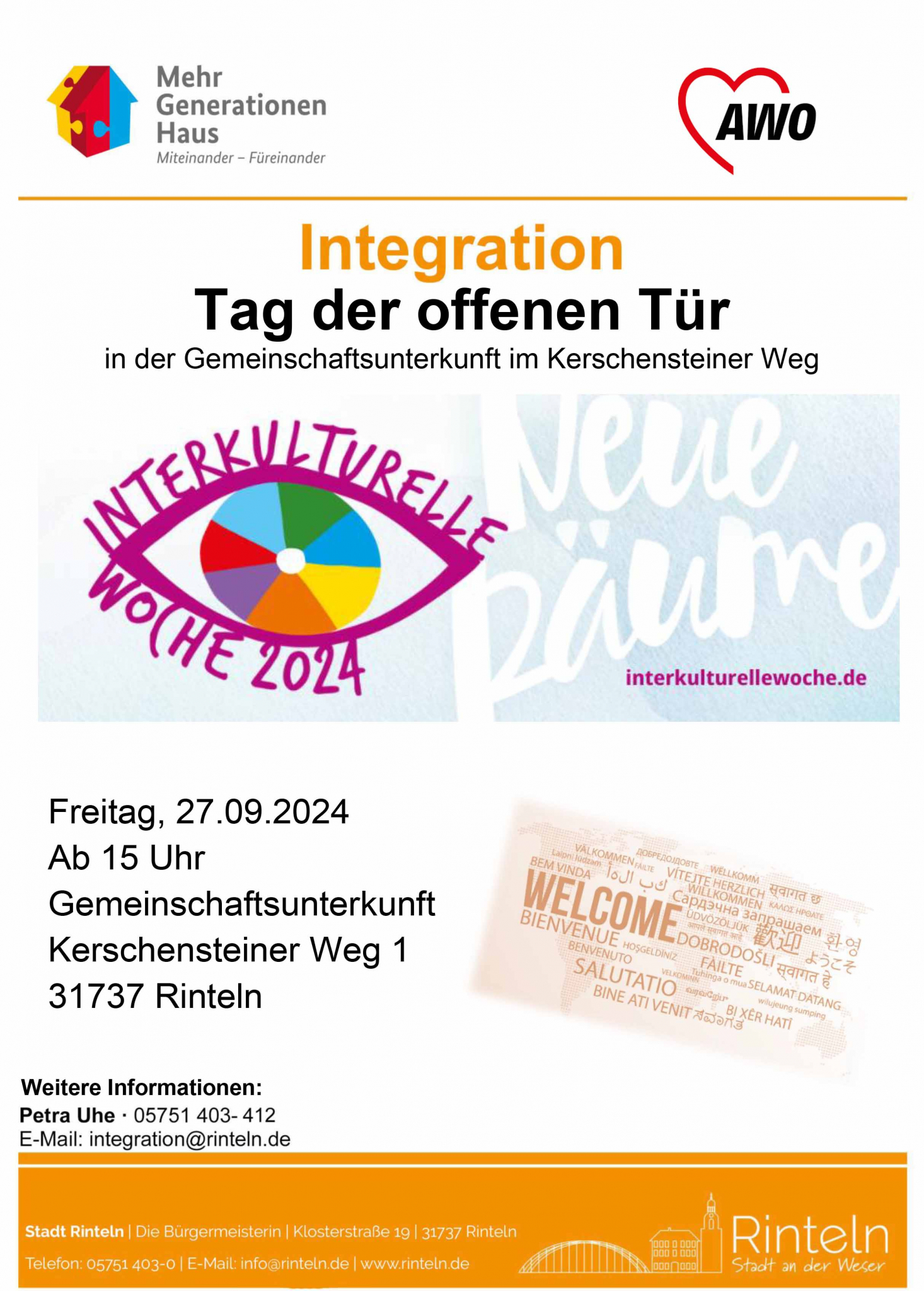„Neue Räume“ lautet das Motto für 2024. Neue Räume schaffen, öffnen, zeigen. Neue Räume der Begegnung und des Austauschs, zum miteinander Lachen und zum gemeinsamen Nachdenken, für die Auseinandersetzung und das Zusammenfinden. In diesem Zusammenhang öffnet am Freitag, 27.09. ab 15 Uhr die Gemeinschaftsunterkunft im Kerschensteiner Weg ihre Türen. Das Integrationsteam der Stadt Rinteln und die AWO laden alle interessierten Bürgerinnen und Bürger herzlich ein, einen Blick in die Lebensräume geflüchteter Menschen zu werfen.