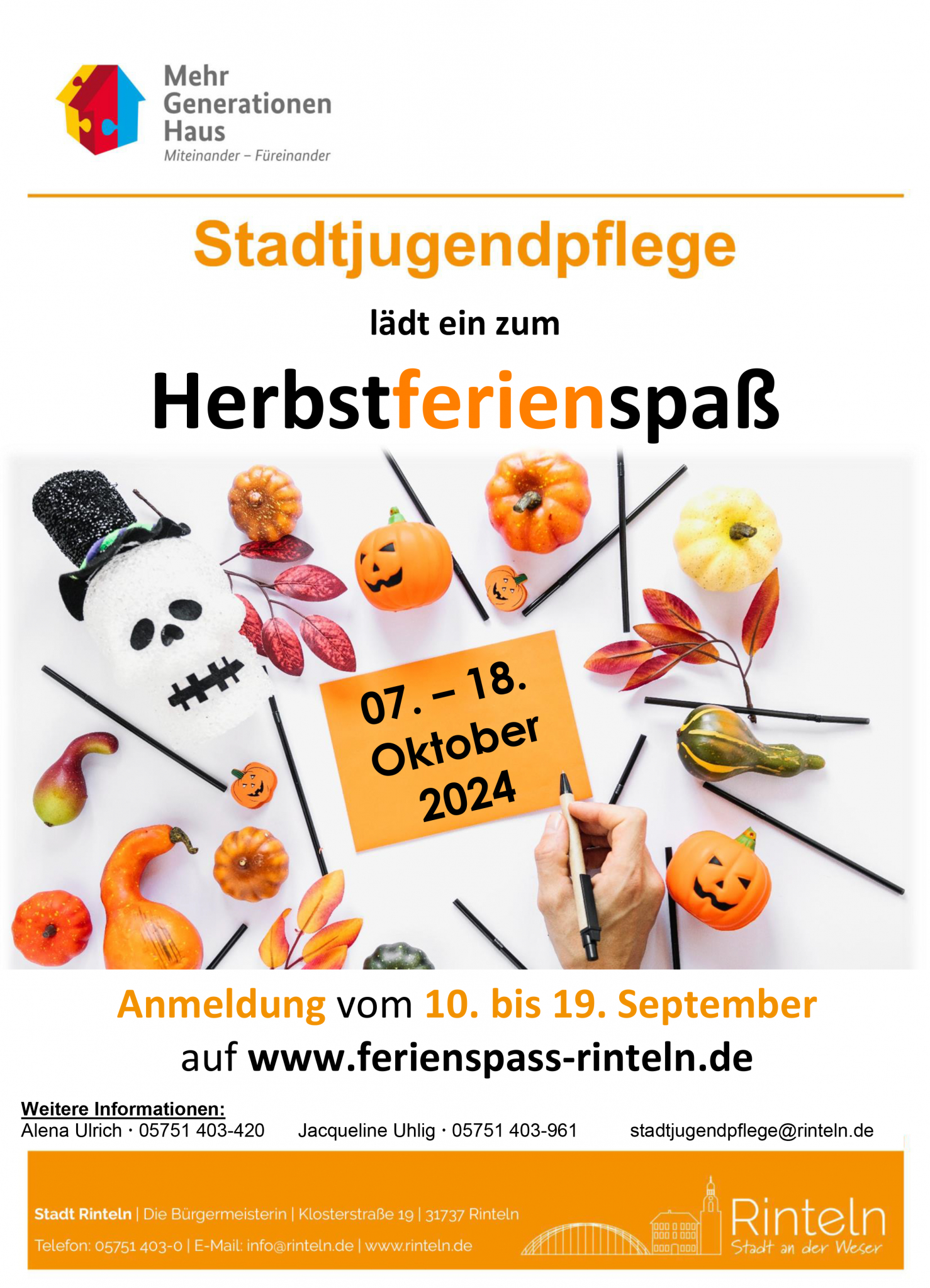 Langeweile in den Herbstferien? Garantiert nicht in Rinteln! Der Herbstferienspaß der Stadtjugendpflege lässt in der schulfreien Zeit keine Langeweile aufkommen! Die ganzen Herbstferien lang gibt es ein abwechslungsreiches Programm gefüllt mit jeder Menge Spiel, Spaß und Aktionen. Von Sportangeboten über Ausflüge, Basteln, Backen und Spielen ist für jede Altersgruppe etwas Passendes dabei.