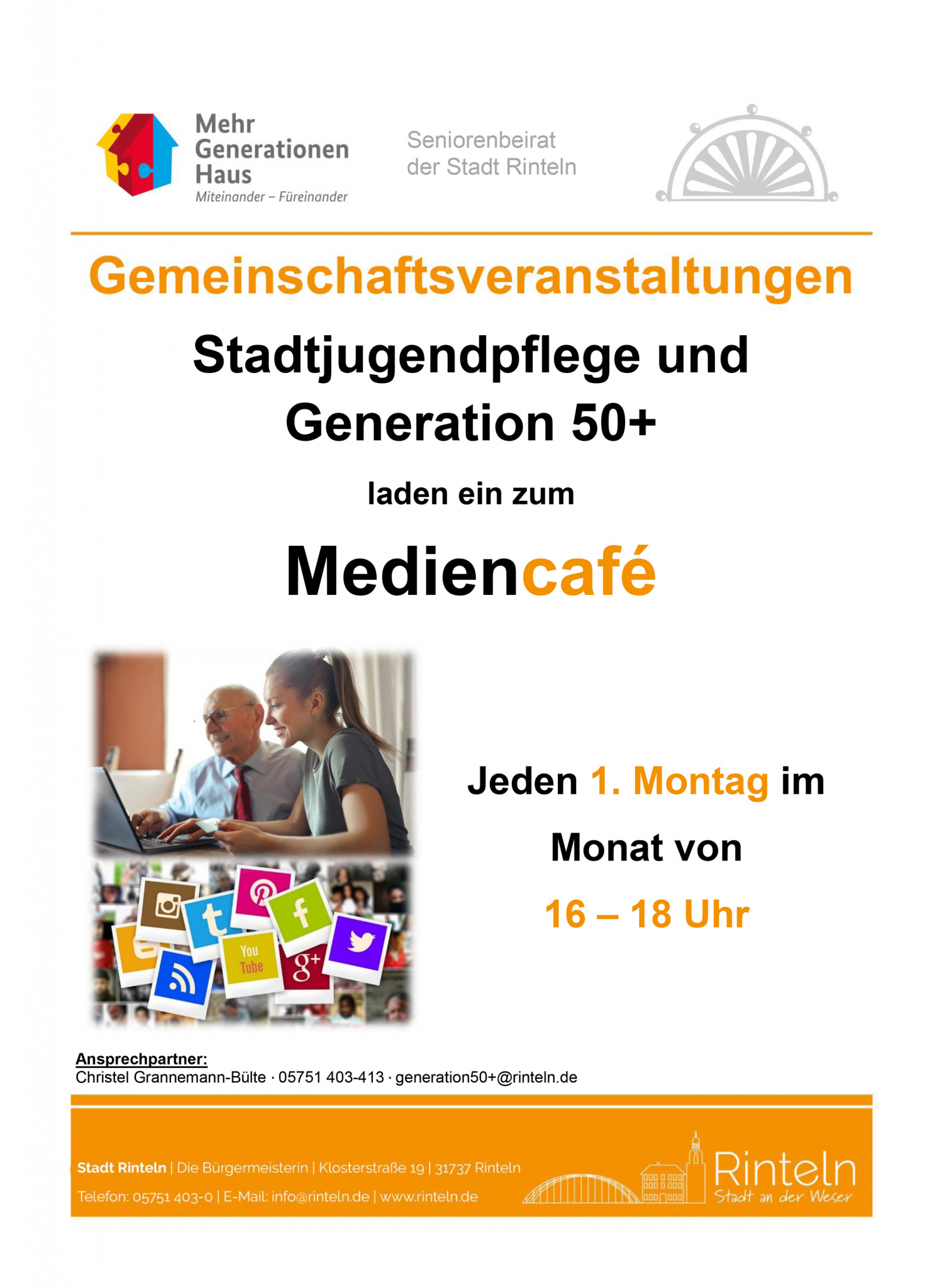 Die Mediennutzung wird gerade für älter werdende Menschen und viele Singlehaushalte immer wichtiger und hilft, am Leben aktiv teilzunehmen, neue Kontakte zu knüpfen und geistig fit zu bleiben. Die Stadtjugendpflege und die „Generation 50+“, begleitet durch die Stiftung für Rinteln, haben mit dem „Mediencafé“ einen Rahmen geschaffen, in dem in entspannter Atmosphäre viele Fragen rund um die Handynutzung, Internetzugänge und vieles mehr geklärt werden können. Fragen werden im Einzelfall geklärt und auf den Umgang mit den Medien wird individuell eingegangen. Den jungen Menschen, die mit dieser Technik groß geworden sind, ist keine Frage zu viel und sie teilen ihr Wissen rund um die Mediennutzung gerne mit der „Generation 50+“.