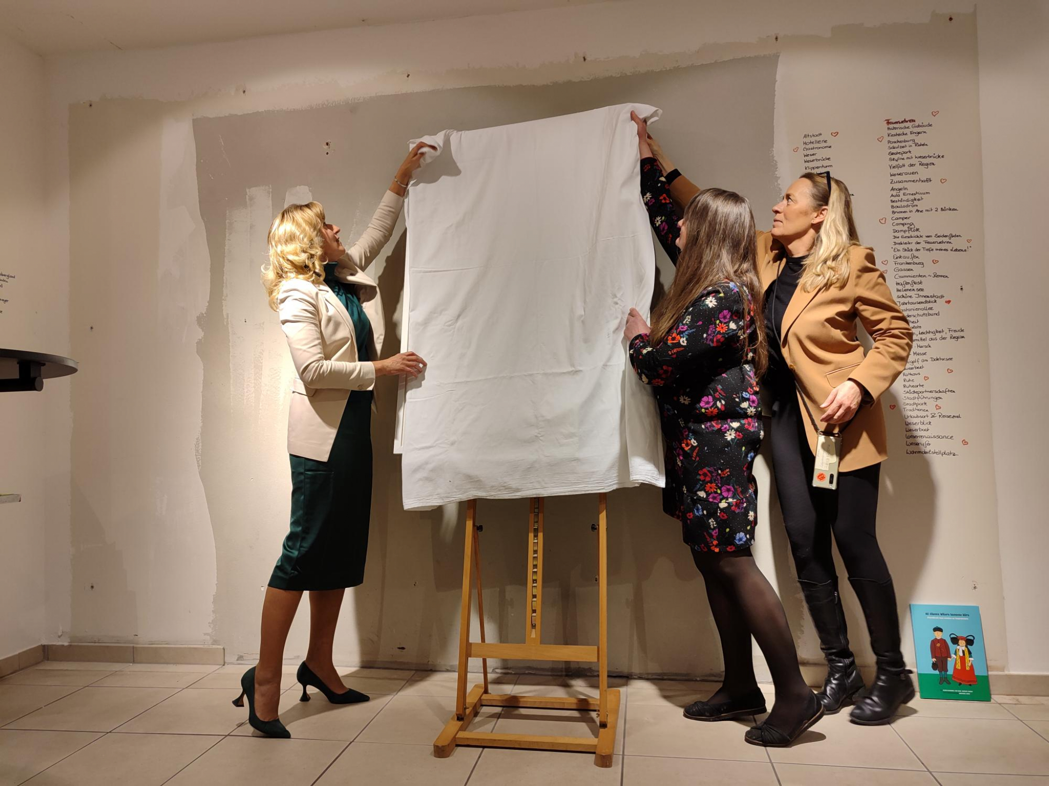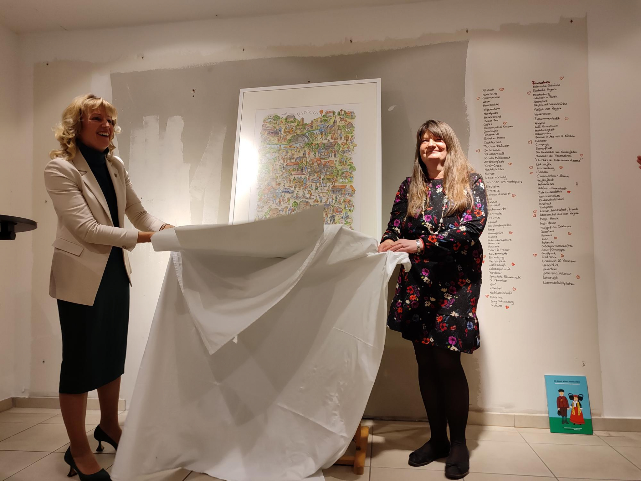 Bürgermeisterin Andrea Lange begrüßte alle und dankte der Rintelner Künstlerin Martina Grandhomme für ihre Arbeit. Die Spannung stieg weiter, denn Andrea Lange bedankte sich bei jedem Rintelner Betrieb für die Preise, die für die Verlosung beigesteuert wurden. Und dann war es so weit: Die Rintelner Künstlerin Martina Grandhomme enthüllte vor dem gespannten Publikum mit der Bürgermeisterin ihr Kunstwerk - das Rintelner Wimmelbild. Grandhomme berichtete den aufmerksam lauschenden Gästen über ihre Recherchen, Spurensuche, die Phasen bis zum finalen Kunstwerk und ihre große Freude an dieser besonderen Arbeit.