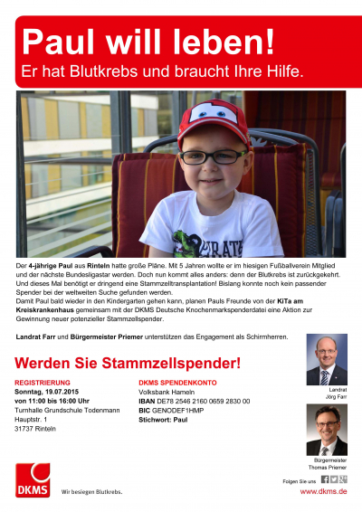 Am Sonntag, 19.07.2015, findet von 11 bis 16 Uhr in der Mehrzweckhalle Todenmann, Bleekebrink 4, die Registrierungsaktion für die Hilfe des an Blutkrebs erkrankten 4-jährigen Paul aus Rinteln statt. Paul benötigt dringend eine Stammzelltransplantation. Die Kosten für die Registrierung bzw.
