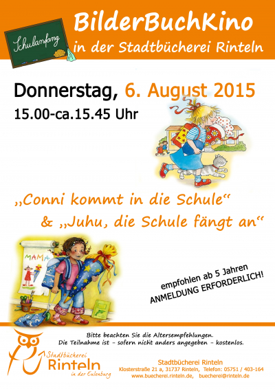Für alle Schulanfänger und Kinder ab 5 Jahren zeigt die Stadtbücherei Rinteln am Donnerstag, 06. August um 15.00 Uhr, die BilderBuchKinos „Conni kommt in die Schule" und „Juhu, die Schule fängt an!"Conni ist schon ganz aufgeregt: Endlich kommt sie in die Schule! Wochenlang haben sich alle auf diesen Tag vorbereitet.