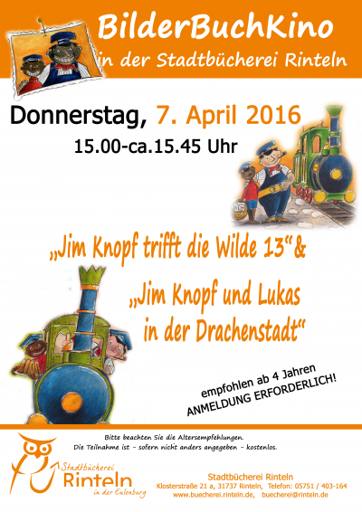 Am Donnerstag, 7. April 2016, zeigt die Stadtbücherei Rinteln in ihren Räumen in der Klosterstraße 21 a um 15 Uhr wieder zwei BilderBuchKinos. Diesmal werden zwei Geschichten um den Kinderliebling „Jim Knopf" gelesen.