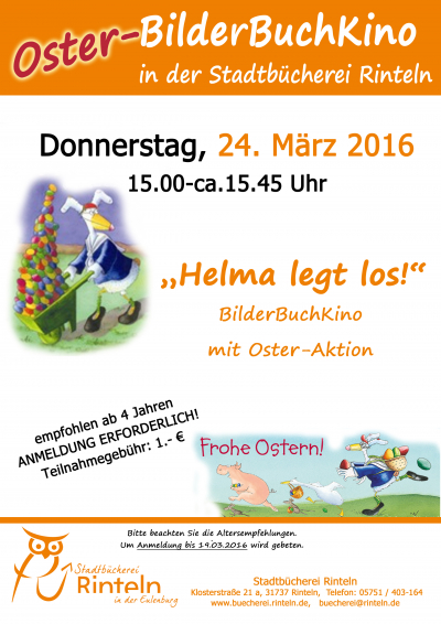 Am 24. März zeigt die Stadtbücherei Rinteln in ihren Räumen in der Klosterstraße 21 a um 15 Uhr, wie jedes Jahr am Gründonnerstag, ein BilderBuchKino mit einer kleinen Oster-Aktion. Diesmal wird das Buch „Helma legt los" gelesen: Alle Hühner in der Hühnerschule legen schöne weiße Eier. Nur Helmas sind bunt.