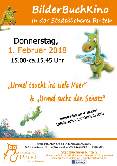 Am Donnerstag, 1. Februar, zeigt die Stadtbücherei Rinteln in ihren Räumen in der Klosterstraße 21 a um 15 Uhr wieder zwei BilderBuchKinos. Diesmal werden zwei Geschichten um den Kinderliebling „Urmel" gelesen. Folgende Geschichten sind zu hören und zu sehen: