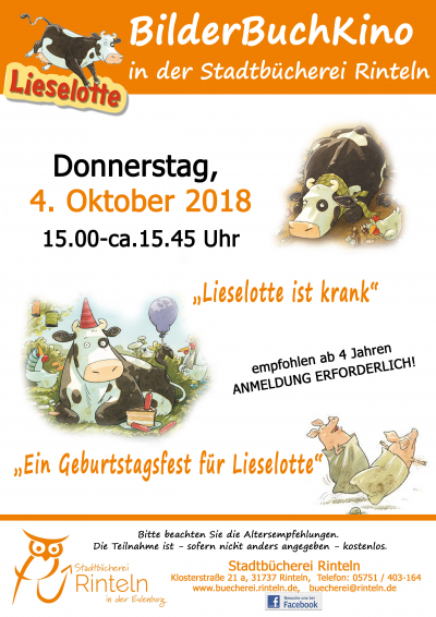 Am Donnerstag, 4. Oktober, zeigt die Stadtbücherei Rinteln in ihren Räumen in der Klosterstraße 21 a um 15 Uhr wieder zwei BilderBuchKinos. Diesmal werden zwei Geschichten vom Kinderbuchliebling, der „Kuh Lieselotte" gelesen. Folgende Geschichten sind zu hören und zu sehen: