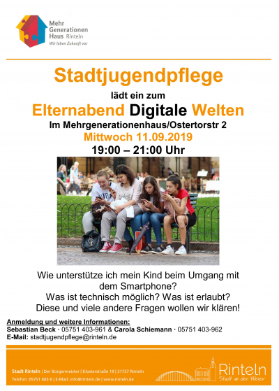 Die Stadtjugendpflege Rinteln lädt in Kooperation mit der Kreisjugendpflege zum Elternabend „Digitale Welten“ ein. Im Leben von Kindern und Jugendlichen haben Medien einen großen Stellenwert. Sie werden im Smartphone gebündelt und genutzt. Die Schwierigkeit liegt darin, dass nicht alles erlaubt ist, was technisch möglich ist.