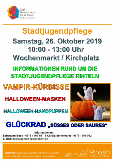 Am Samstag, 26. Oktober 2019 zwischen 10 und 13 Uhr bietet die Stadtjugendpflege diverse Mitmach-Aktionen für Kinder und Jugendliche rund um das Thema Halloween auf einem Stand auf dem Rintelner Wochenmarkt an.